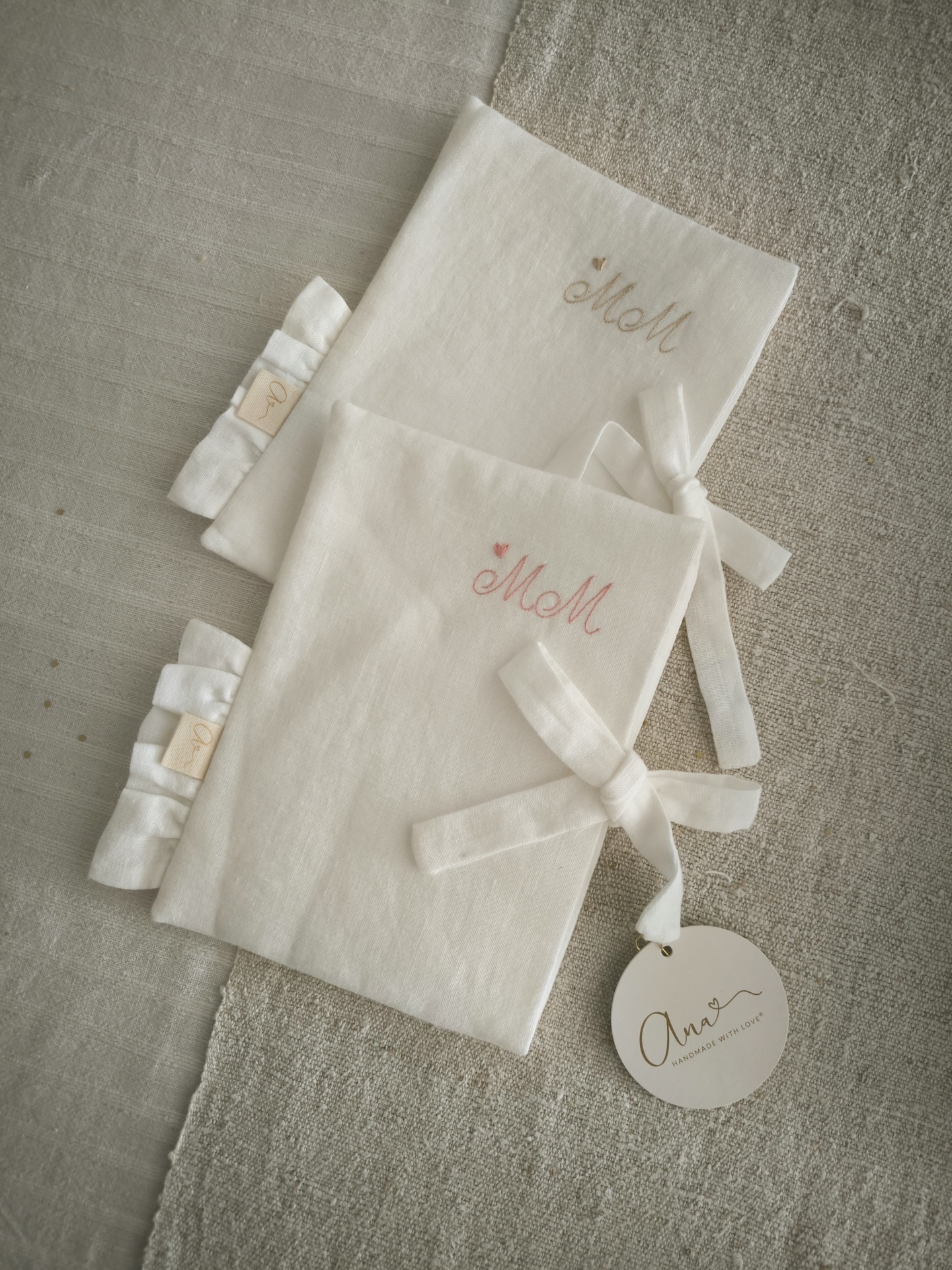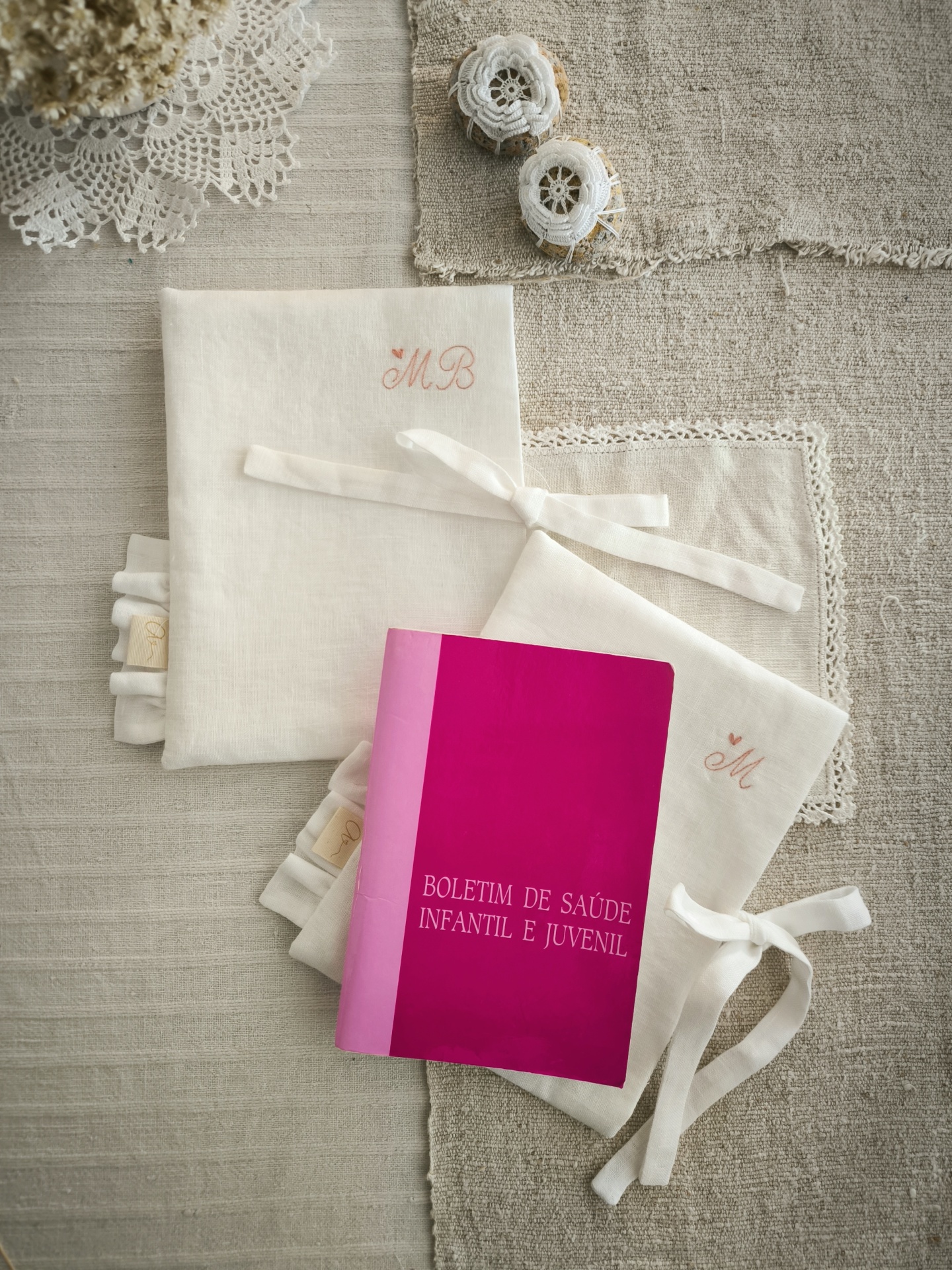 Porta-documentos personalizado 28,00 € Desconto de %. Partilhar personalização cor do bordado - Comprar Contactar SKU: SD02 Estão sempre ali, é o lugar seguro para guardar e transportar os documentos dos mais pequenos. É bordado à mão com o nome ou inicial e um pequeno coração. Feito em linho puro branco e com forro de 100% algodão Bordado à mão por encomenda. O prazo de entrega é de cerca de um mês.