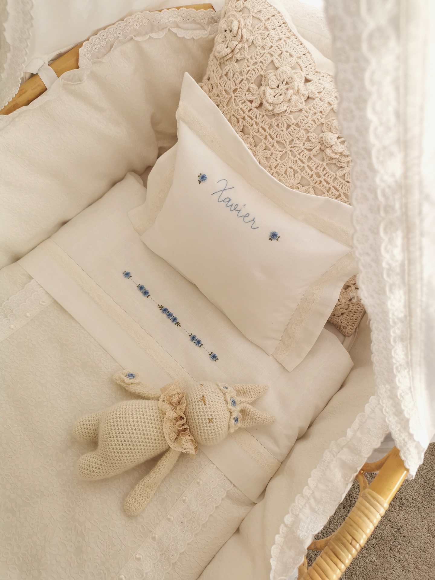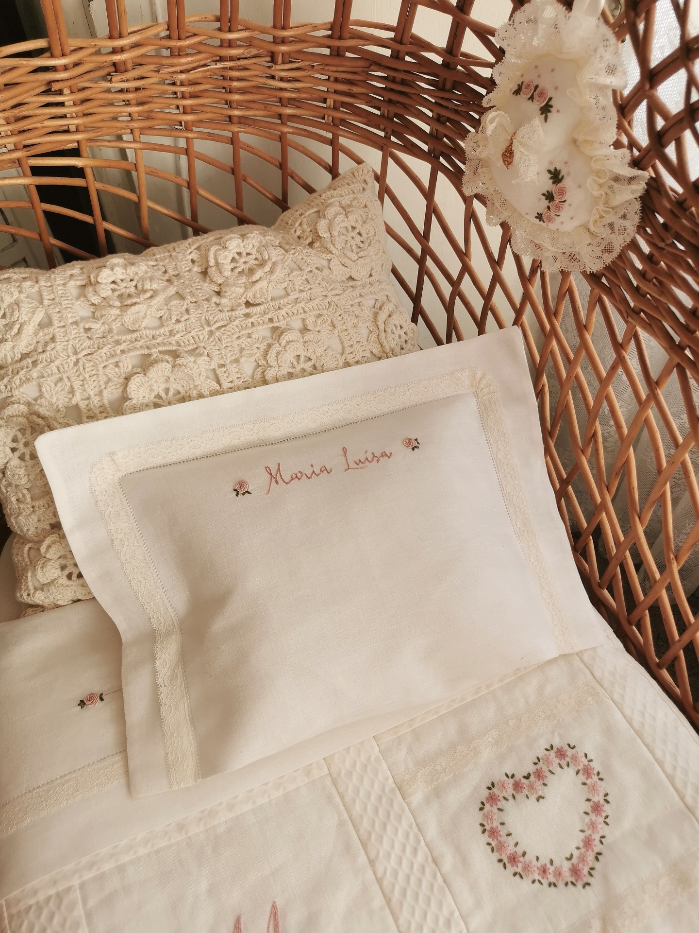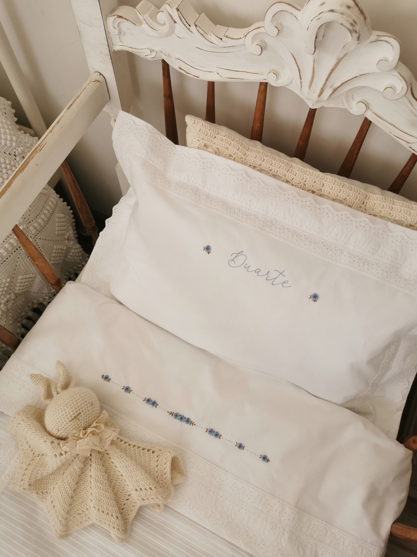 A almofada é personalizada com o nome ou inicial do bebé e detalhe de flores, criando um peça exclusiva e ainda mais especial|