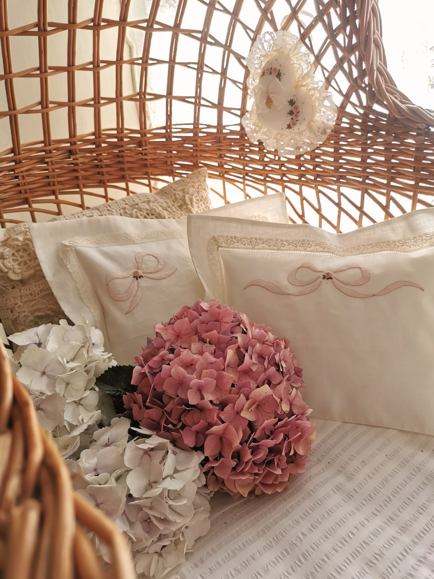 • Cadeira de vime com almofadas bordadas, flores artificiais, e coração decorativo pendurado