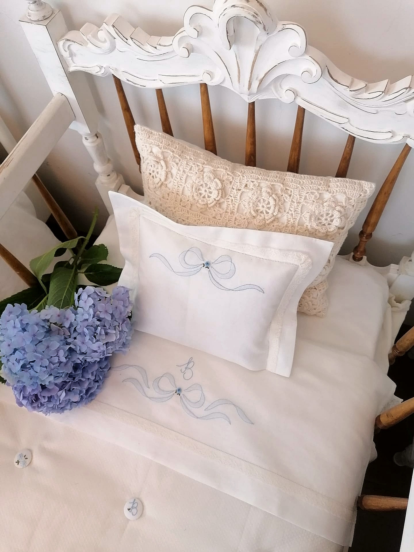 A almofada é bordada à mão com o desenho do laço e detalhe de flor. É um modelo clássico e intemporal que queremos guardar para sempre e que poderá ser usado entre gerações !