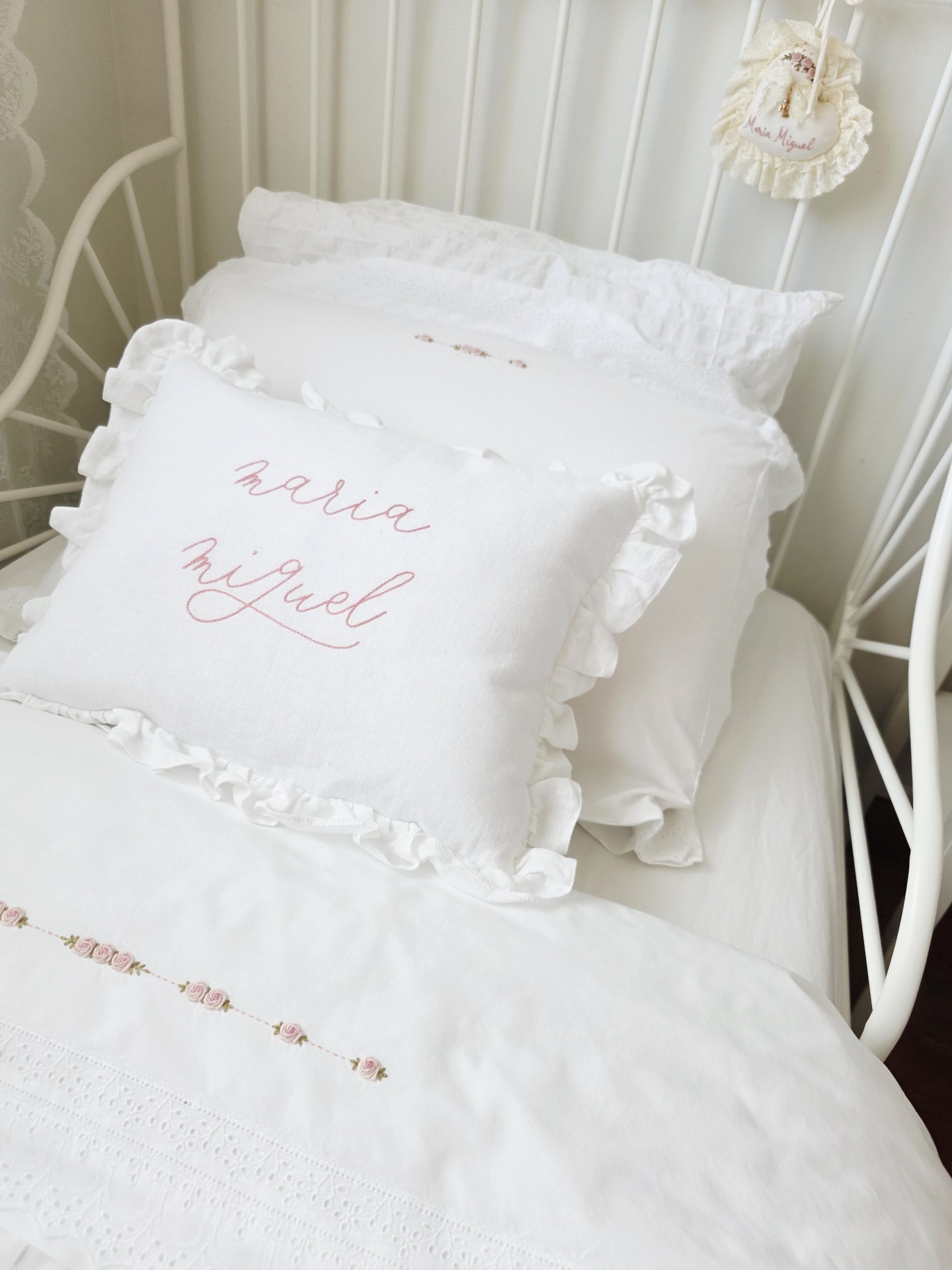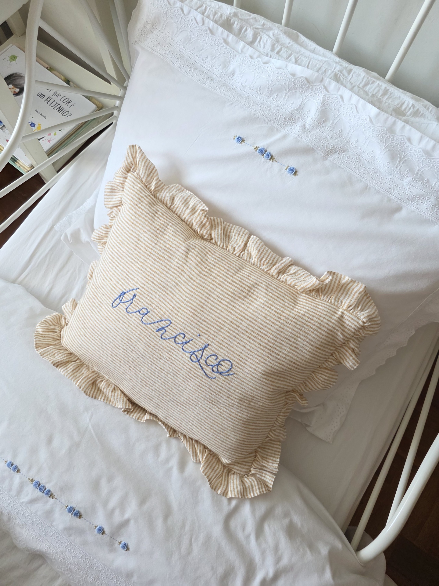A almofada é personalizada com o nome ou inicial do bebé, criando um peça exclusiva e ainda mais especial! É bordada à mão em 100% linho e com detalhe de folho.