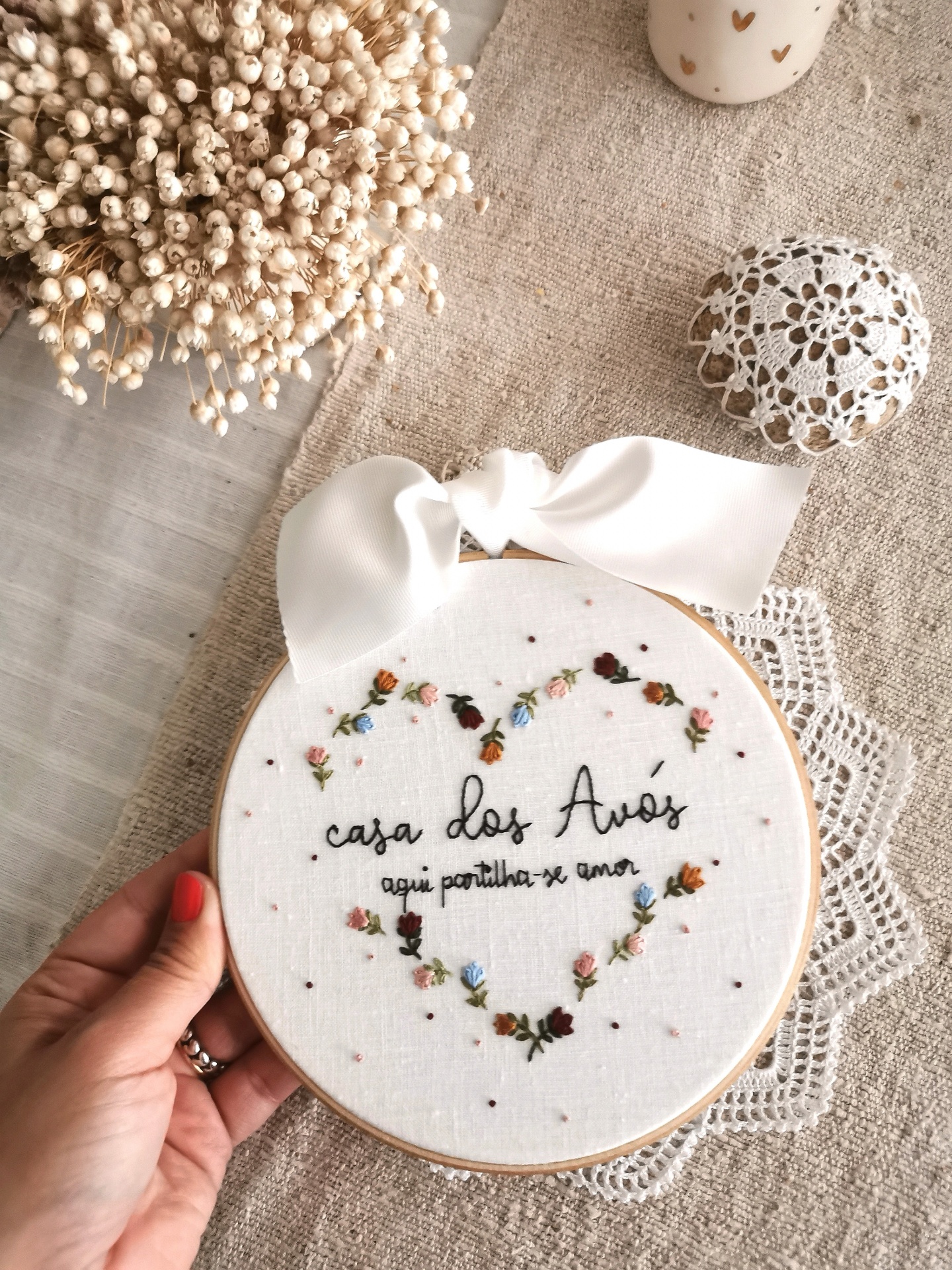 arco casa dos Avós 48,00 € Desconto de %. Partilhar Formato Arco redondo moldura quadrada personalização arco - 4,00 € Comprar Contactar Os Avós criam memórias que o coração guarda para sempre! Bordado à mão em linho e com acabamento em arco de madeira com 15 cm de diâmetro É possível acrescentar o detalhe do nome ou inicial para tornar a peça única e ainda mais especial. Pode escolher o acabamento em bastidor de madeira redondo ou com moldura quadrada de carvalho - 23x23 cm Bordado à mão por encomenda. O prazo de entrega é de cerca de um mês.