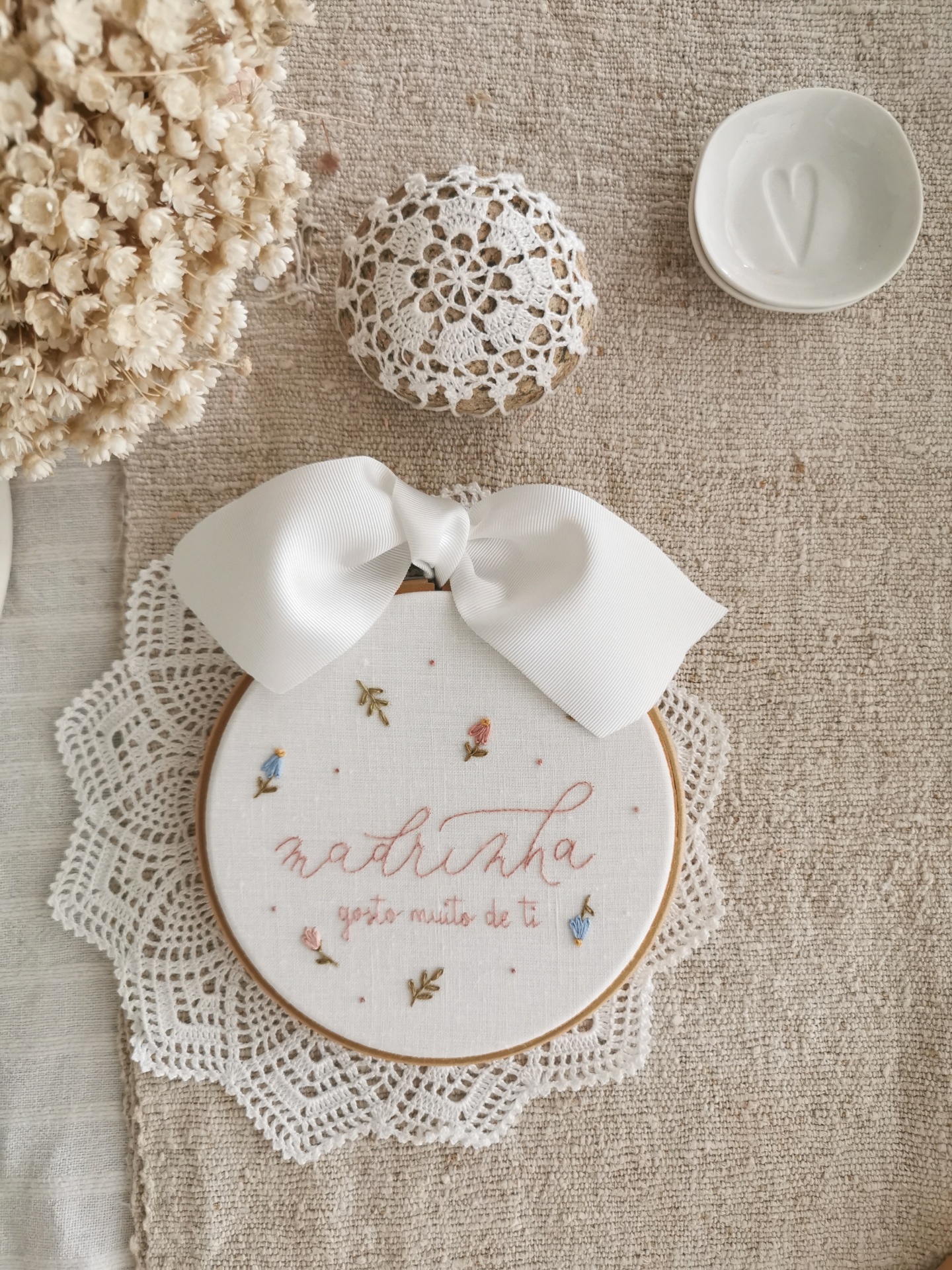 arco Madrinha 30,00 € Desconto de %. Partilhar personalização arco - 4,00 € Comprar Contactar Madrinha, gosto muito de ti ! são presentes feitos de Amor, eternizam momentos e guardam memórias para sempre! arco bordado à mão em linho com 12 cm de diâmetro Bordado à mão por encomenda. O prazo de entrega é de cerca de um mês.