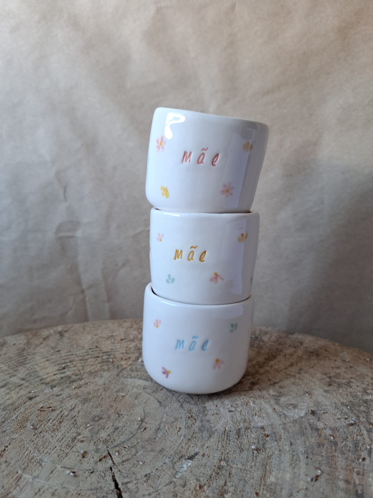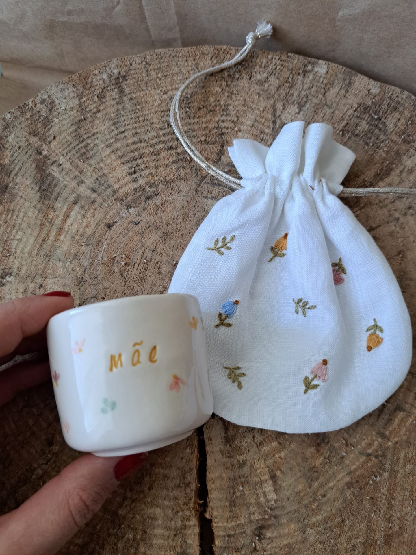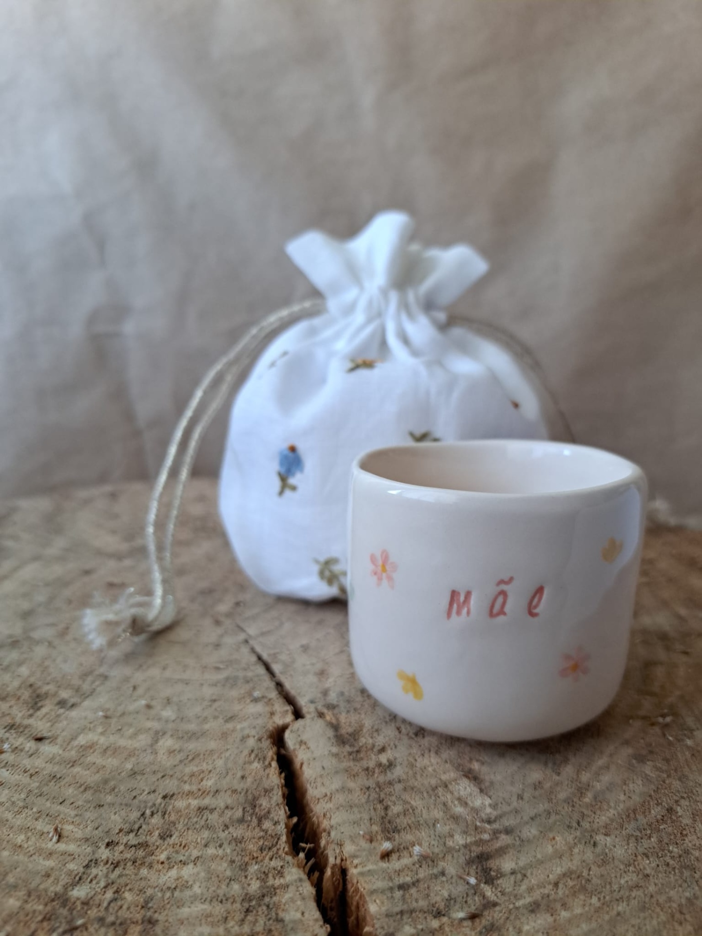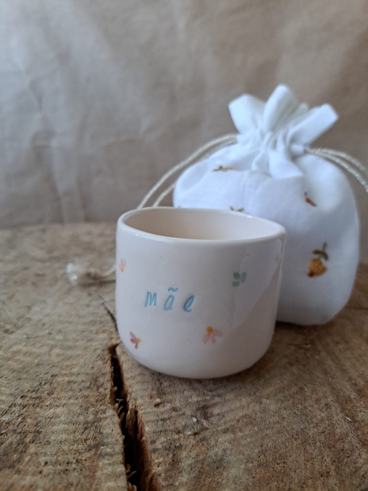 Chávena personalizada com a palavra mãe ou mamã numa cor à escolha, disponível em três tons pastel. Cada chávena é pintada à mão com motivos florais, com pequenas flores coloridas e folhinhas. Pode escolhê-la no tamanho S ou M .