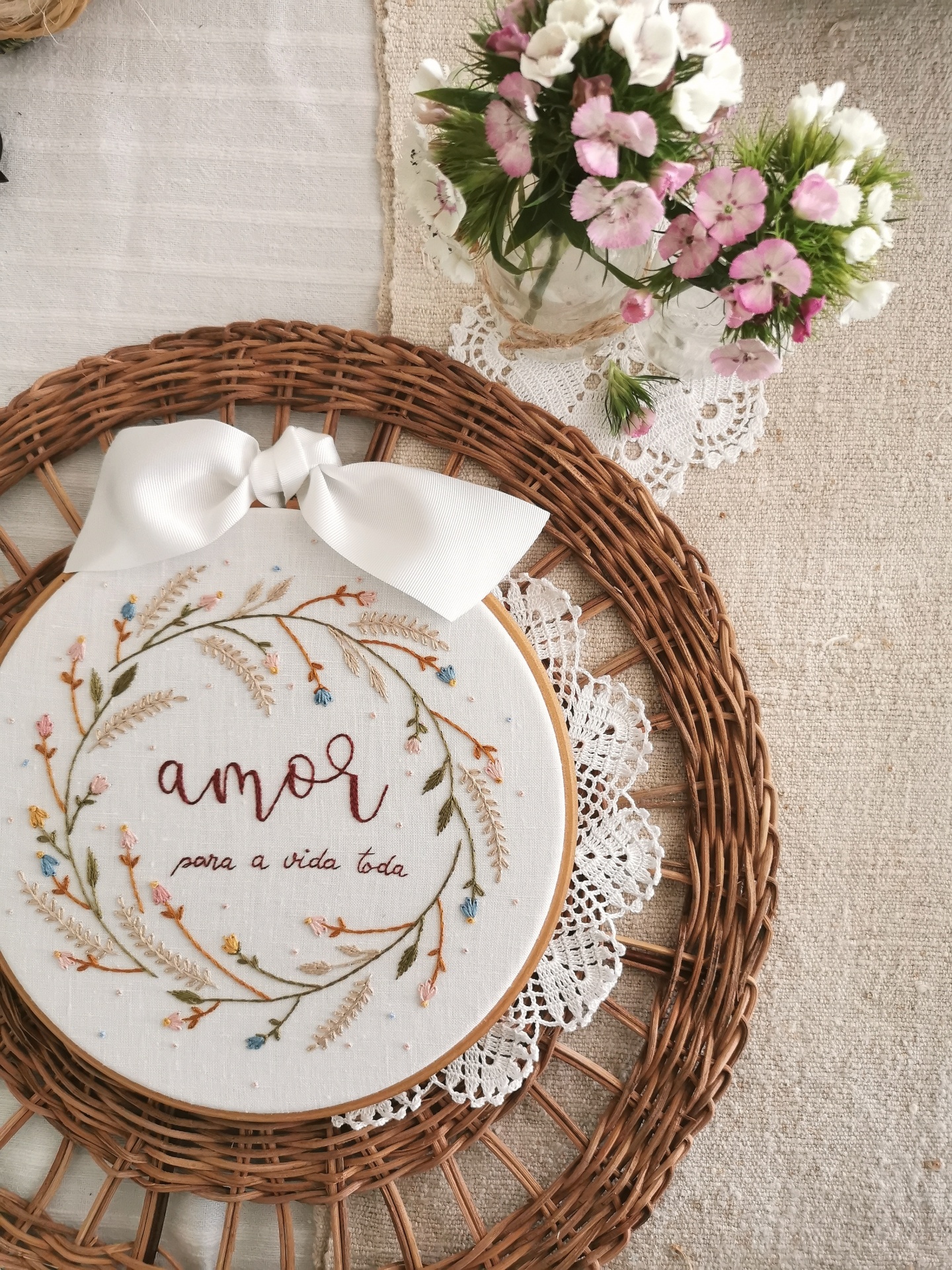 Arco Amor 75,00 € Desconto de %. Partilhar Comprar Contactar SKU: AMSG02 que seja Amor - para a Vida toda! Bordado em linho - 20 cm de diâmetro Bordado à mão por encomenda. O prazo de entrega é de cerca de um mês.