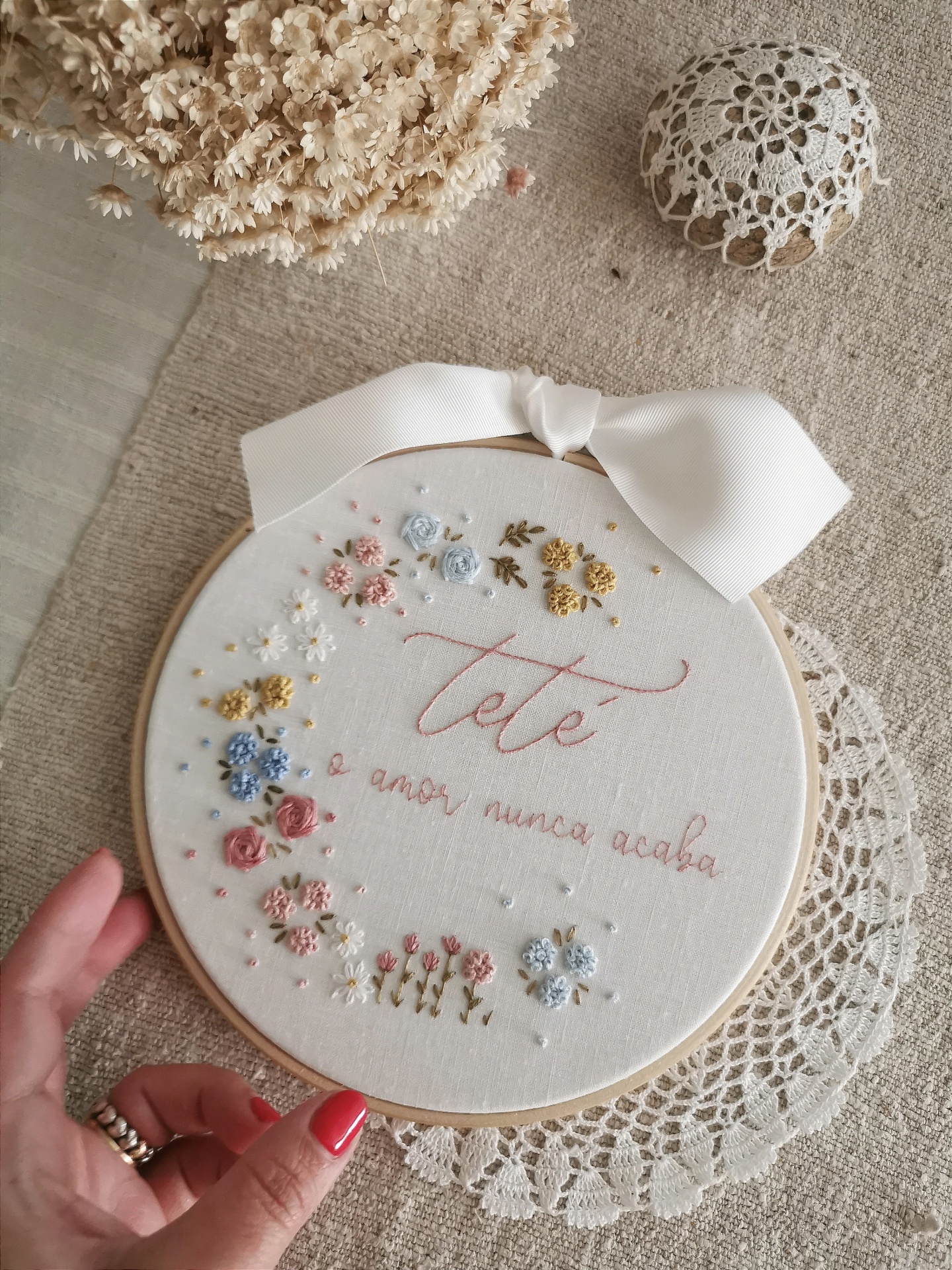 arco personalizado 56,00 € Desconto de %. Partilhar mensagem personalizada Comprar Contactar SKU: AMSG05 Bordado em linho - 18 cm de diâmetro pode escolher personalizar a mensagem Bordado à mão por encomenda. O prazo de entrega é de cerca de um mês.