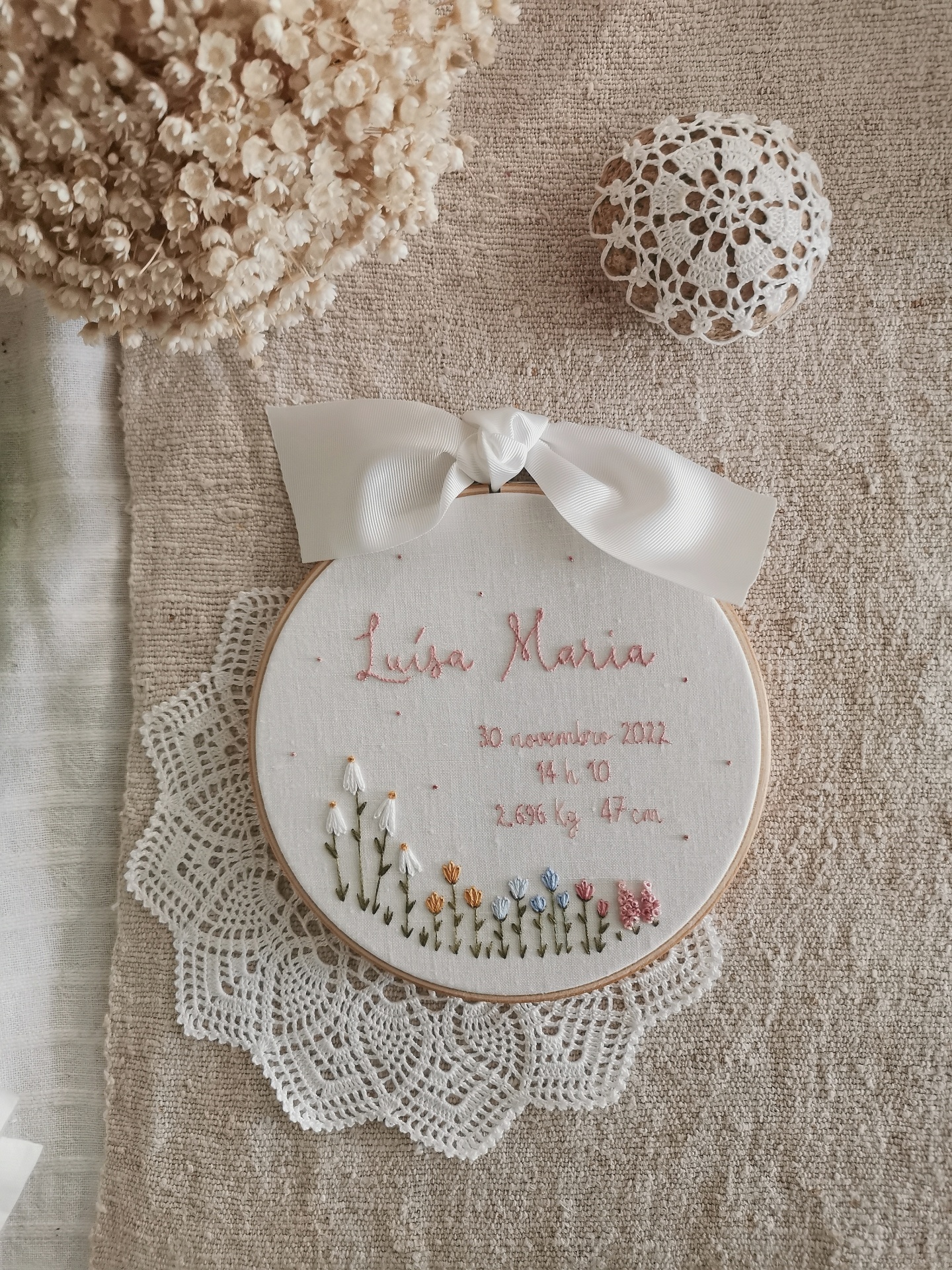 Arco de nascimento 52,00 € Desconto de %. Partilhar dados de nascimento Comprar Contactar SKU: AN04 O arco personalizado com os dados de nascimento é o complemento perfeito para tornar o quarto do Bebé um lugar único, acolhedor e mágico. Para pendurar na porta, na parede ou na caminha... são tantas as possibilidades! É uma peça de decoração para guardar para sempre! Bordado à mão em linho e com acabamento em arco de madeira com 18 cm de diâmetro Bordado à mão por encomenda. O prazo de entrega é de cerca de um mês.