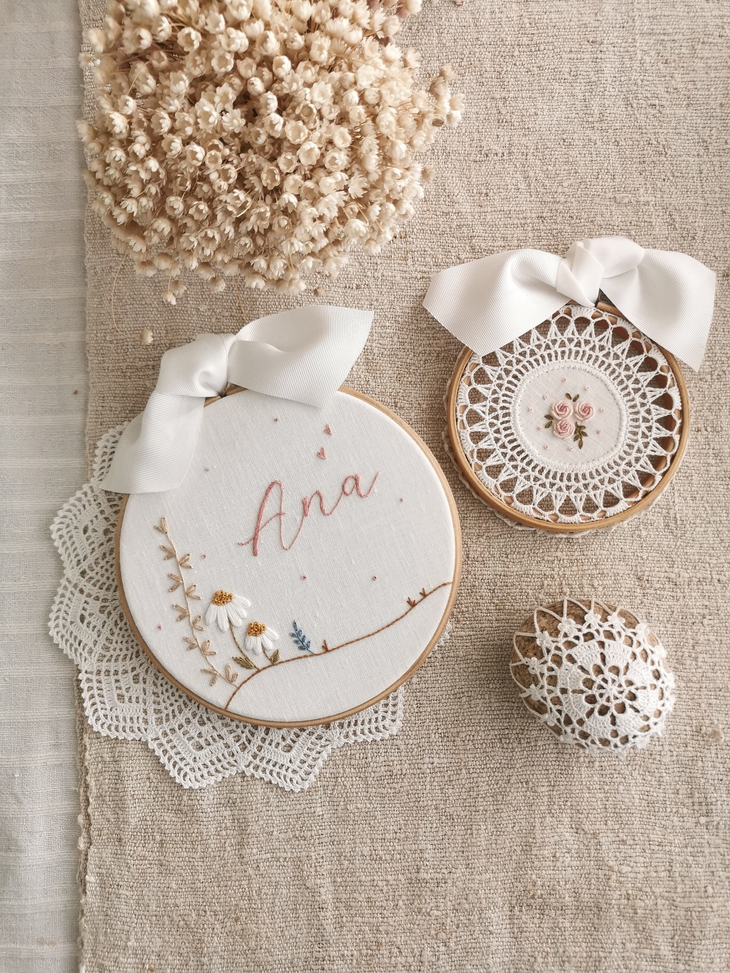 Bordado à mão em linho e com acabamento em arco de madeira com 15 cm de diâmetro