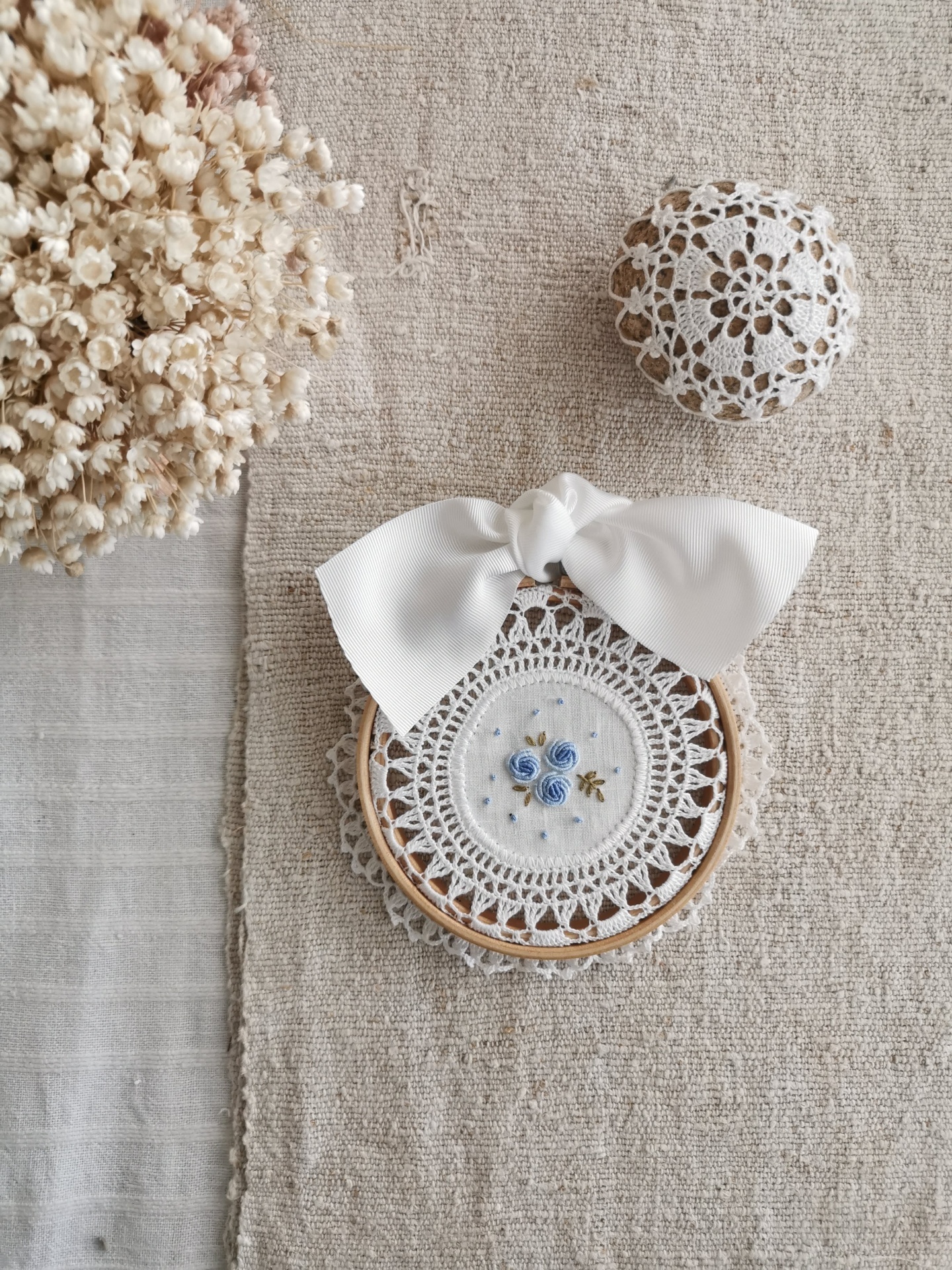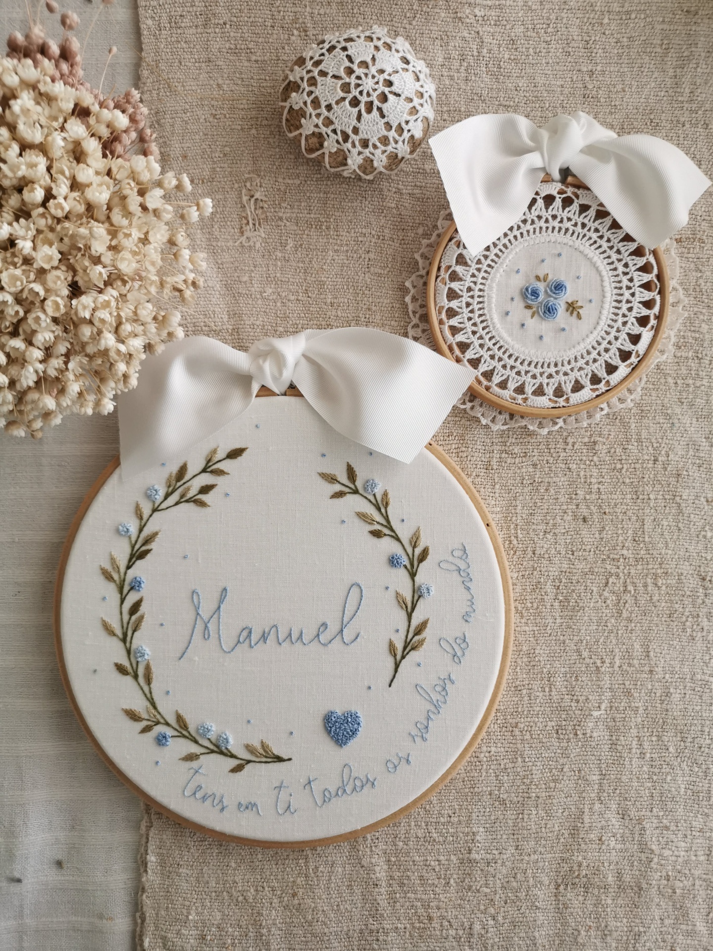 arco crochet com flores 35,00 € Desconto de %. Partilhar cor do bordado - Comprar Contactar SKU: ANM09 É uma peca de decoração para guardar para sempre! É doce e delicado, sozinho ou para fazer um conjunto com outro bordado, transformam a nossa casa e podem ser um presente perfeito. Bordado à mão em linho, com detalhe de crochet e com acabamento em arco de madeira com 15 cm de diâmetro Bordado à mão por encomenda. O prazo de entrega é de cerca de um mês.