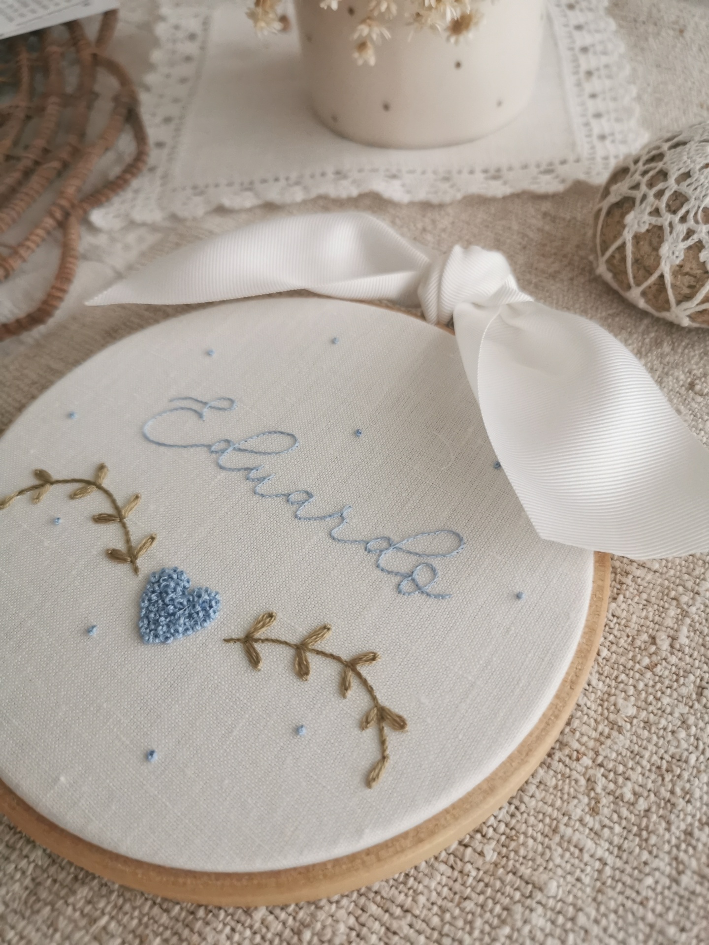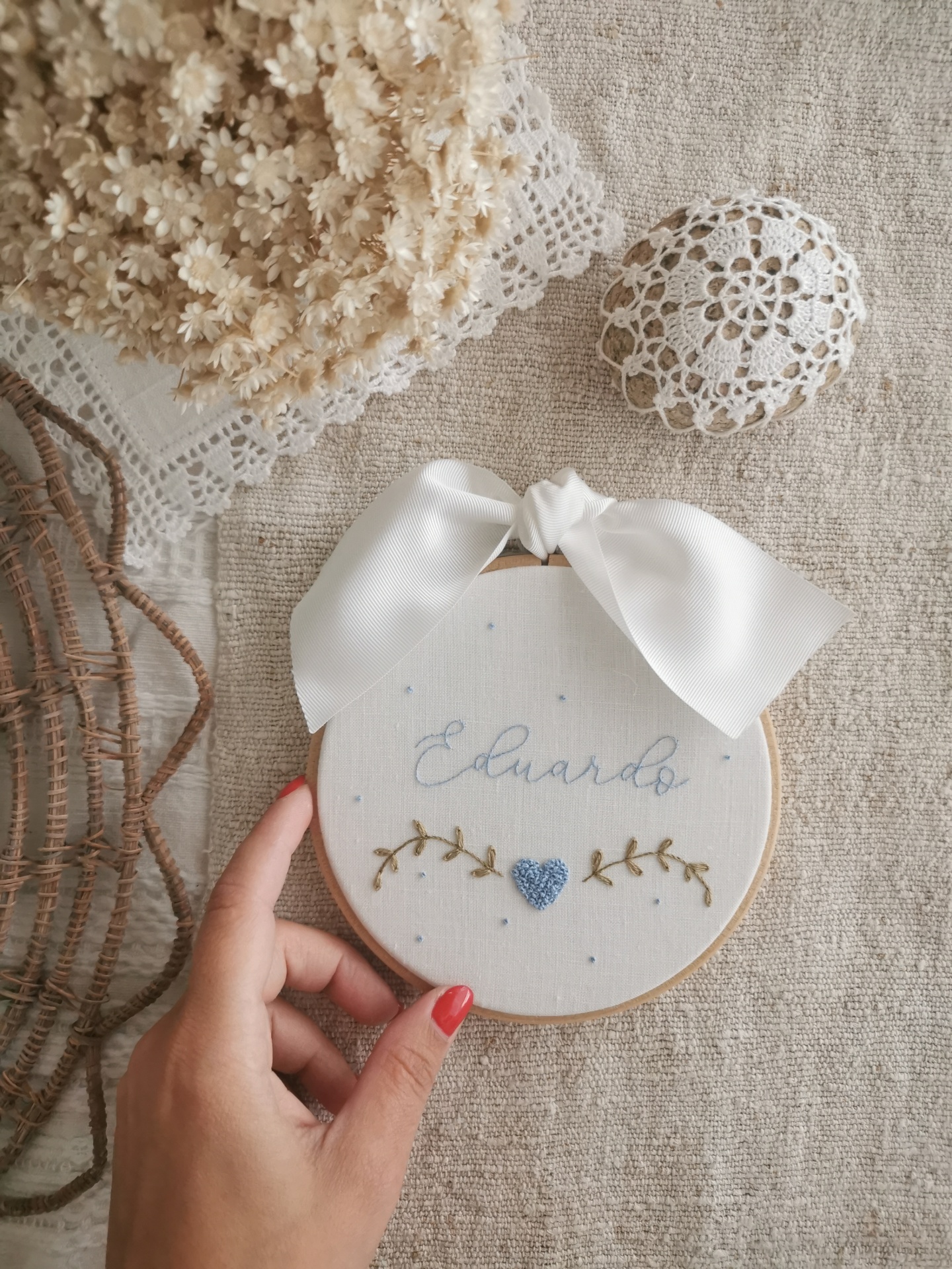 • Bastidor de madeira com bordado do nome Eduardo, coração azul e laço branco sobre mesa de linho