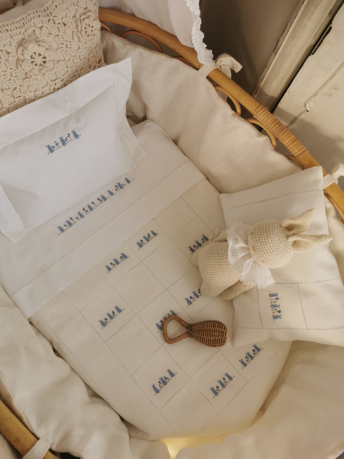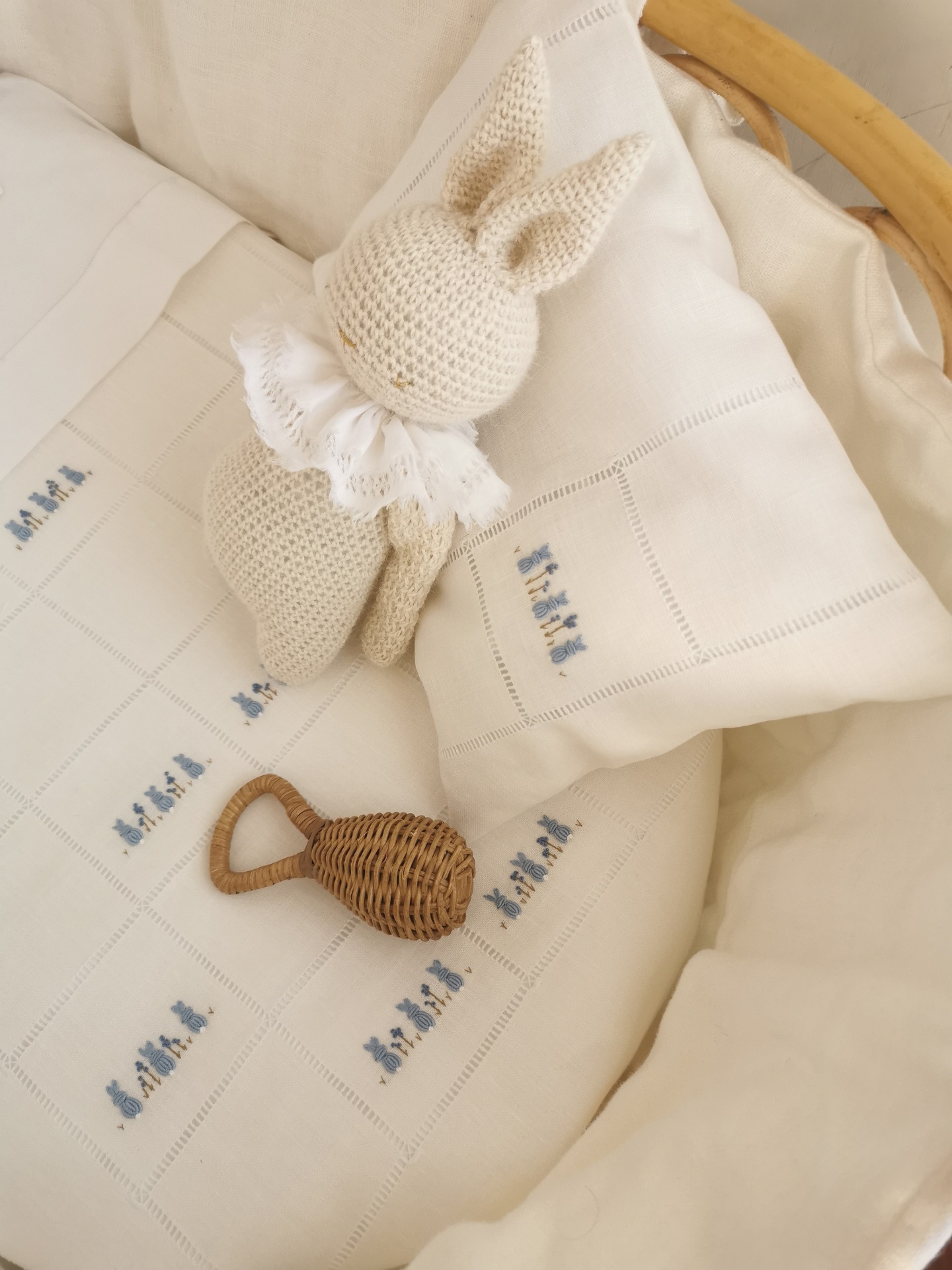 A colcha é feita em linho com detalhe de ponto aberto manual e bordado de coelhinhos. É um modelo clássico e intemporal que queremos guardar para sempre e que poderá ser usado entre gerações !