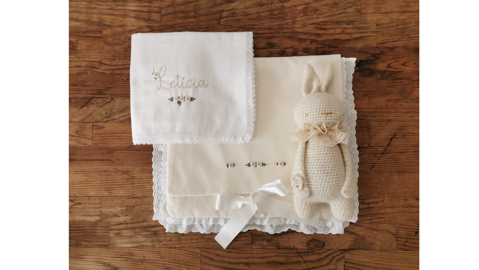 conjunto de nascimento 105,00 € Desconto de %. Partilhar personalização Comprar Contactar SKU: CNASC01 o conjunto da foto inclui : - saquinho para a roupa com motivo floral - fralda personalizada - Lampantim Bordado à mão por encomenda. O prazo de entrega é de cerca de um mês.