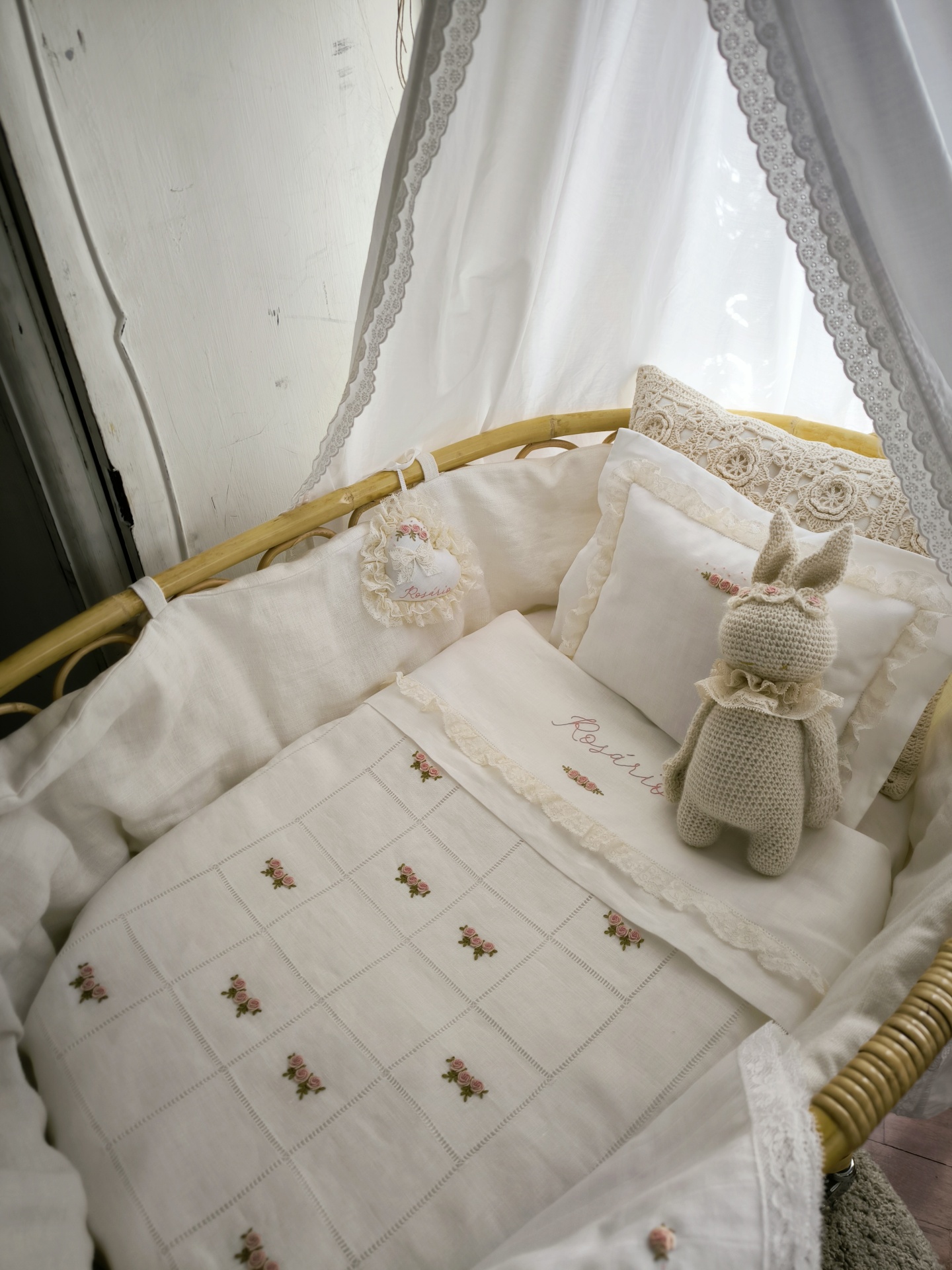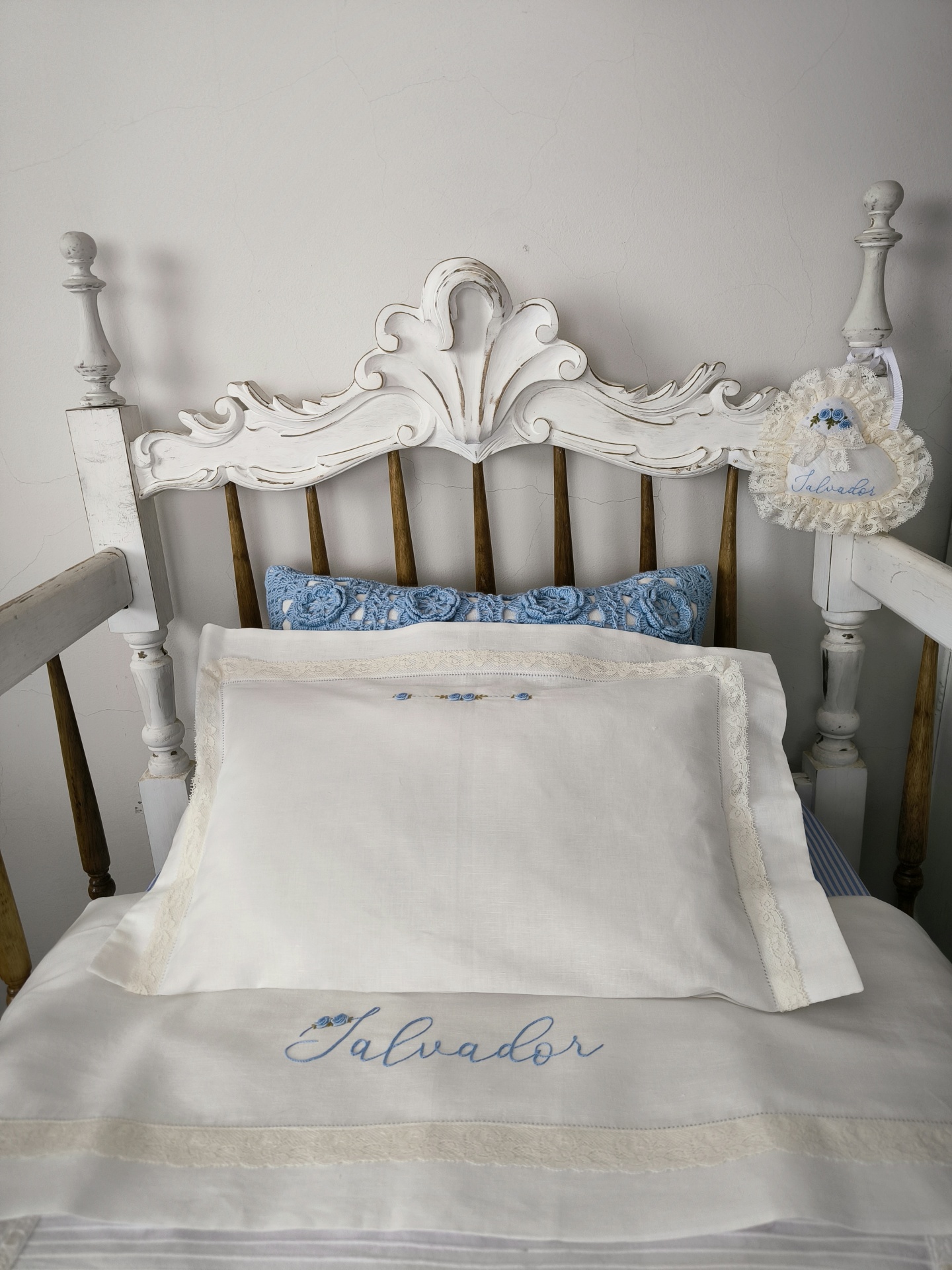 O coração é bordado à mão em linho puro com acabamento de renda valencienne aplicada à mão.
