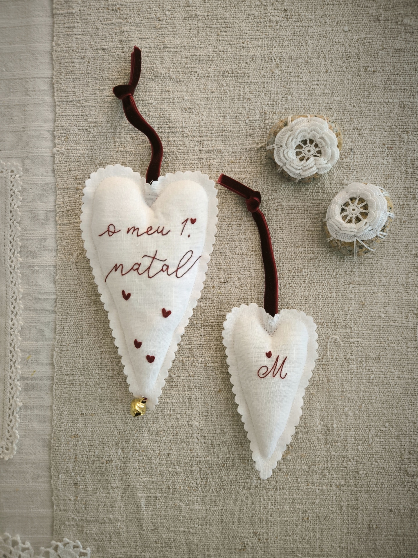 o meu 1.º Natal 18,00 € Desconto de %. Partilhar nome / inicial - 5,00 € Comprar Contactar uma data tão mágica e especial que queremos guardar para sempre no nosso coração! pode ser personalizado na parte de trás com o nome, inicial ou data. Bordado à mão em linho puro, com detalhe de fita de veludo e sininho dourado altura -18 cm aproximadamente