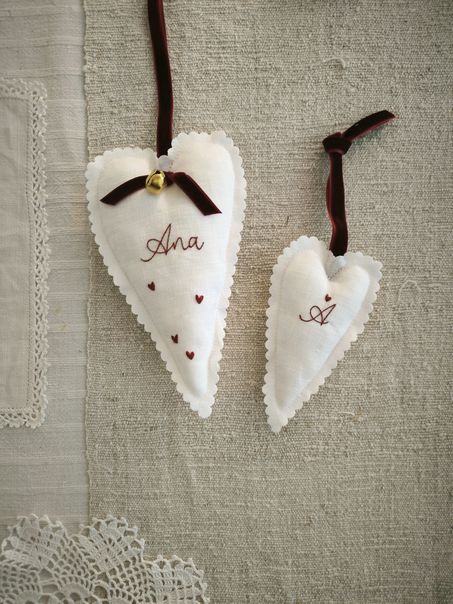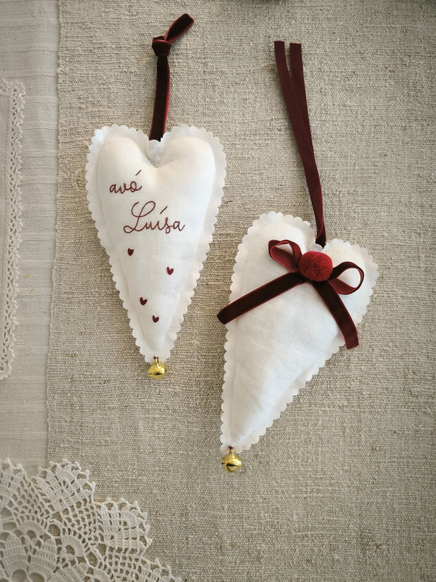 coração de Natal personalizado 20,00 € Desconto de %. Partilhar personalização Comprar Contactar são corações feitos de Amor ! Levam desejos e magia Guardam memórias para sempre! personalizado com o nome ou inicial - max. 10 caracteres Bordado à mão em linho puro, com detalhe de fita de veludo e sininho dourado altura -18 cm aproximadamente