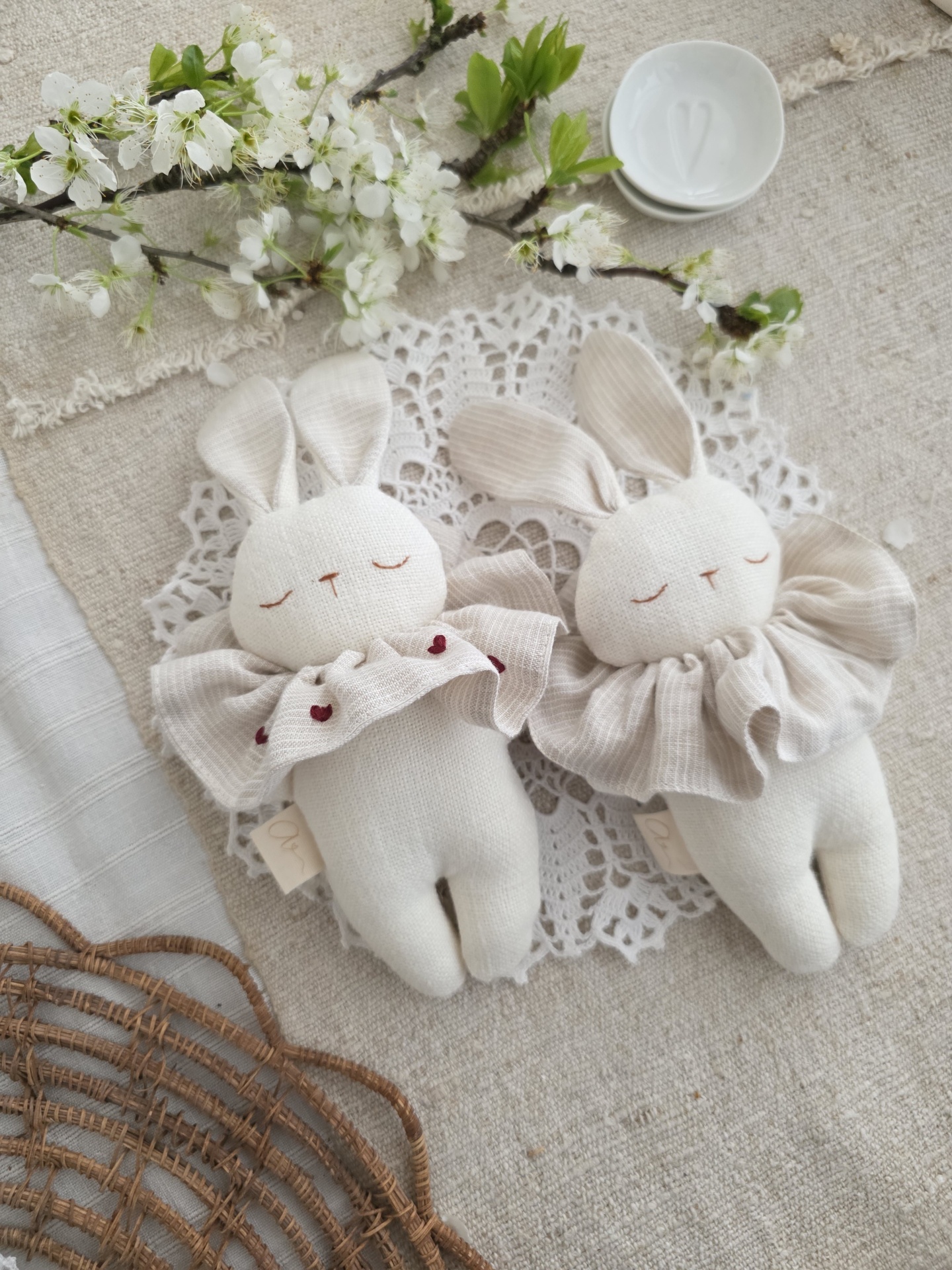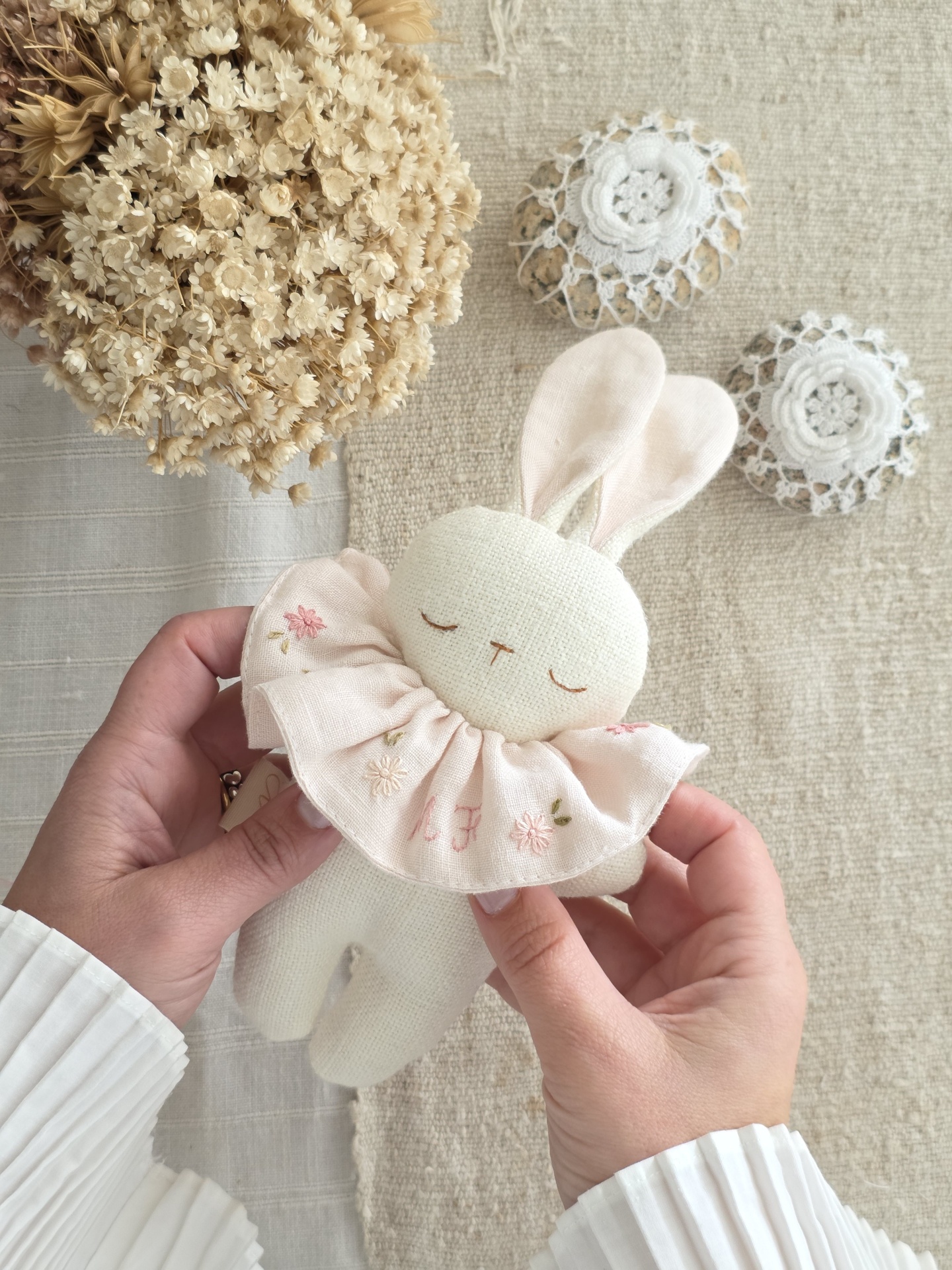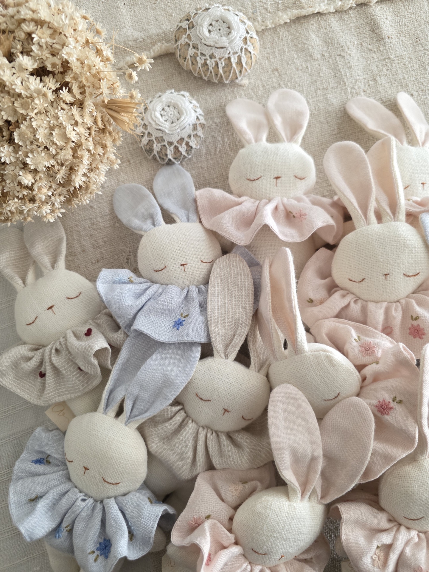 Todos os detalhes são feitos com cuidado e carinho para que este seja o coelhinho mais doce: golinha de linho com detalhe de flores, corações ou as iniciais.