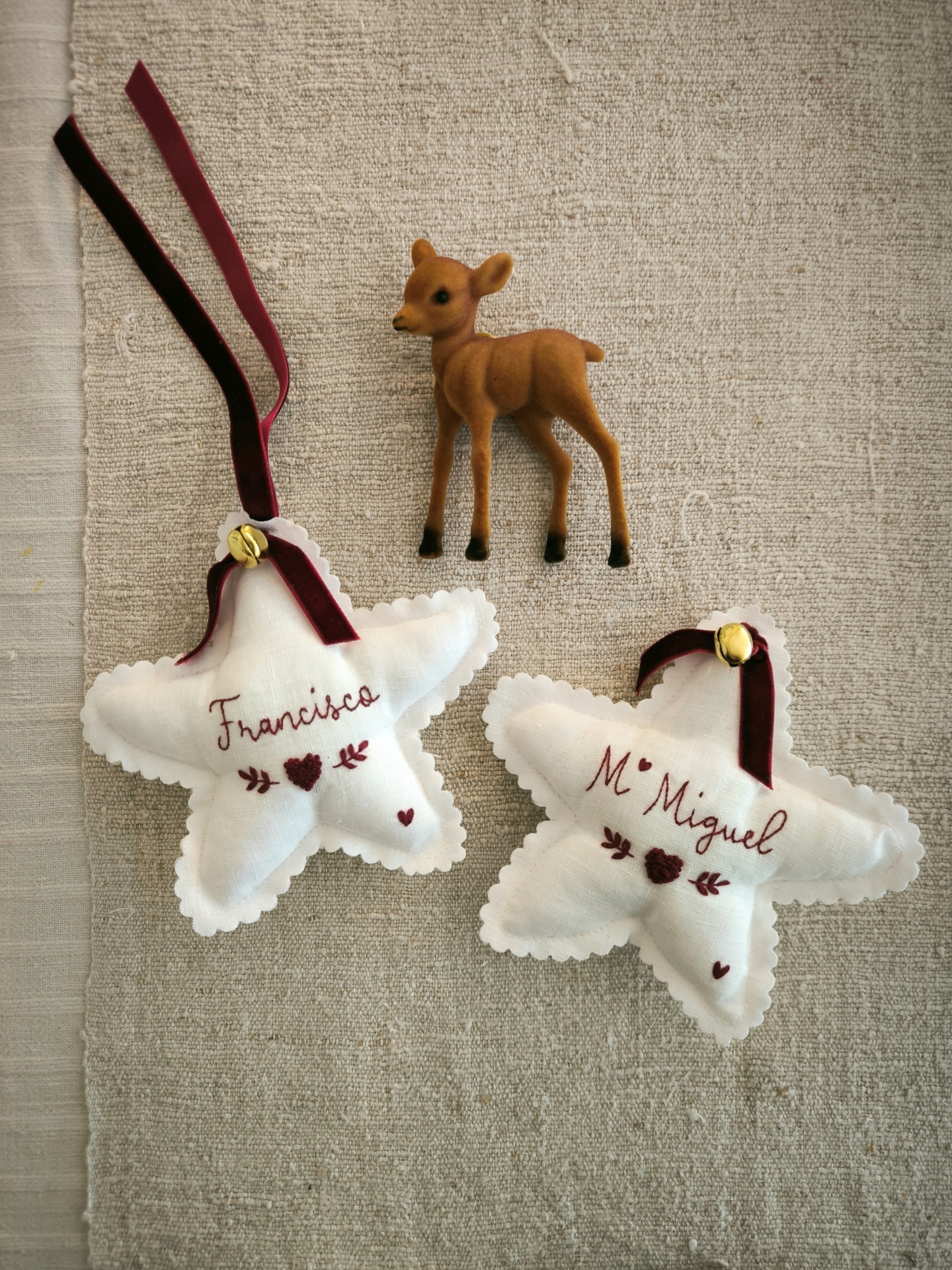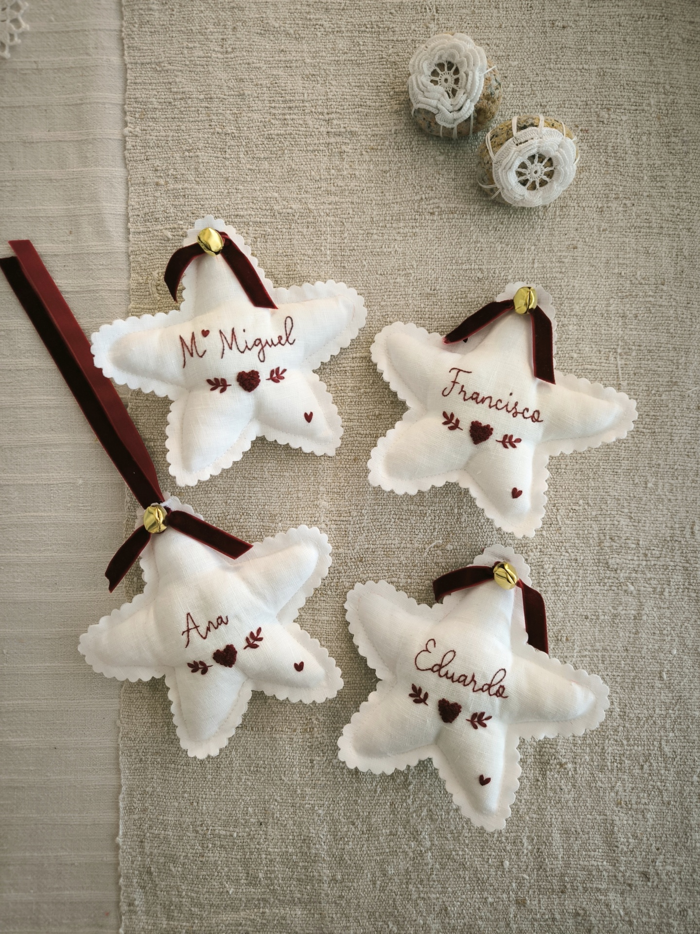 Estrela de Natal personalizada 22,00 € Desconto de %. Partilhar personalização Comprar Contactar Estrelas de Natal Trazem desejos e magia e guardam memórias para sempre! Bordado à mão em linho puro, com detalhe de fita de veludo e sininho dourado altura -18 cm aproximadamente