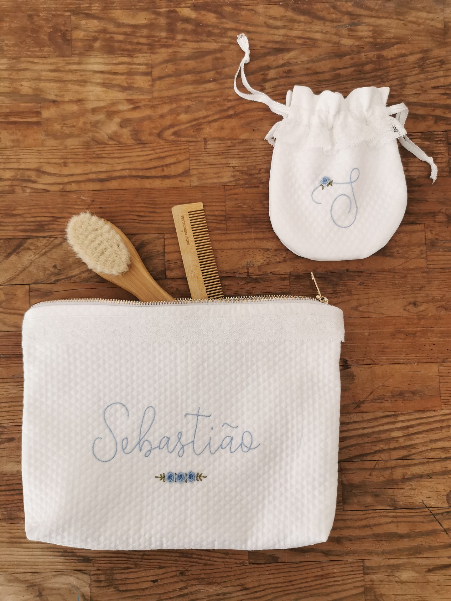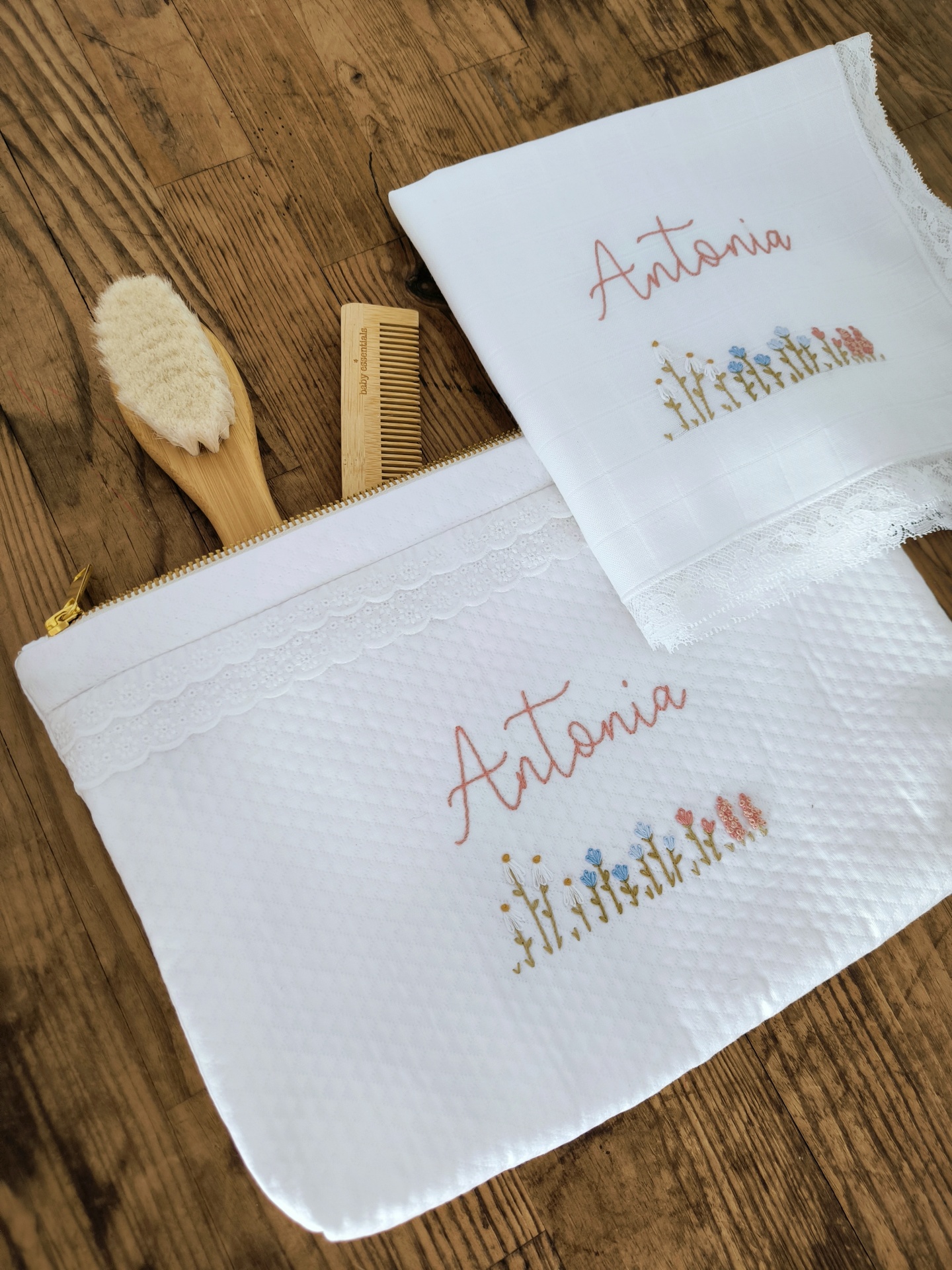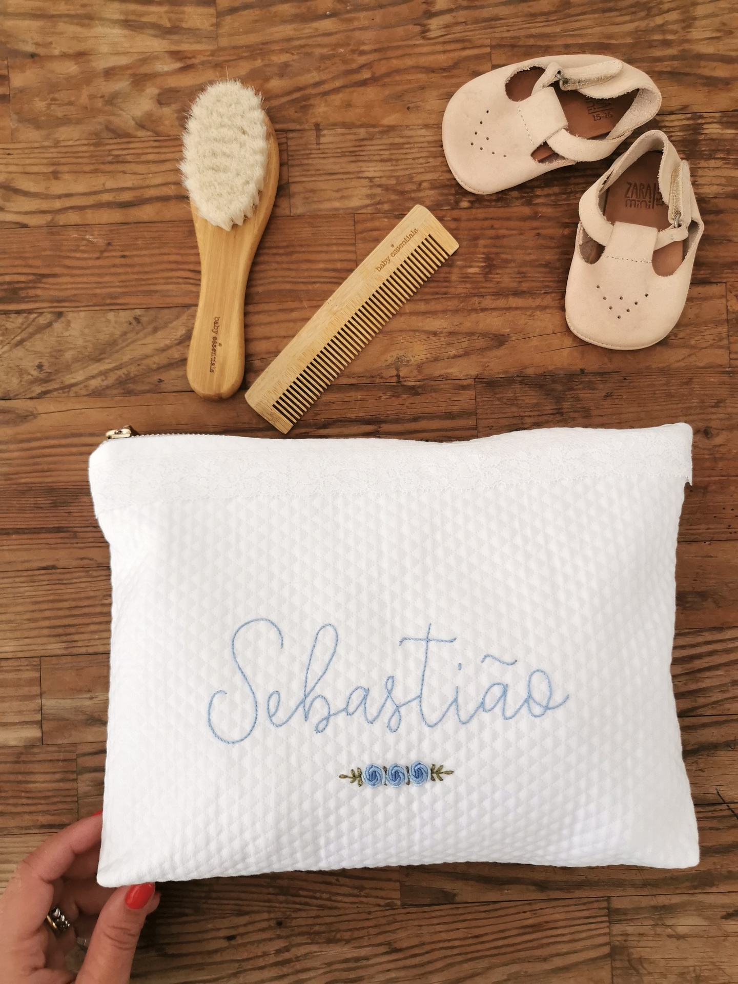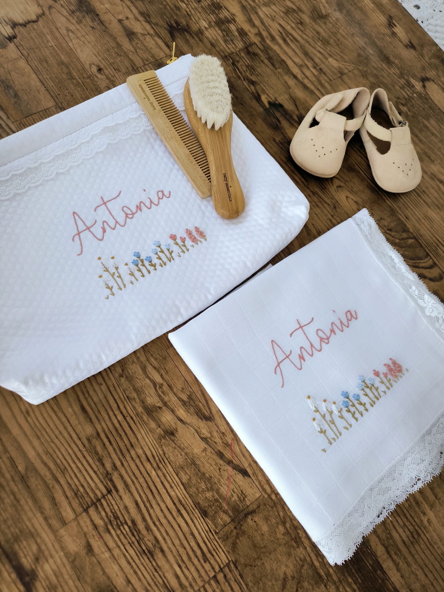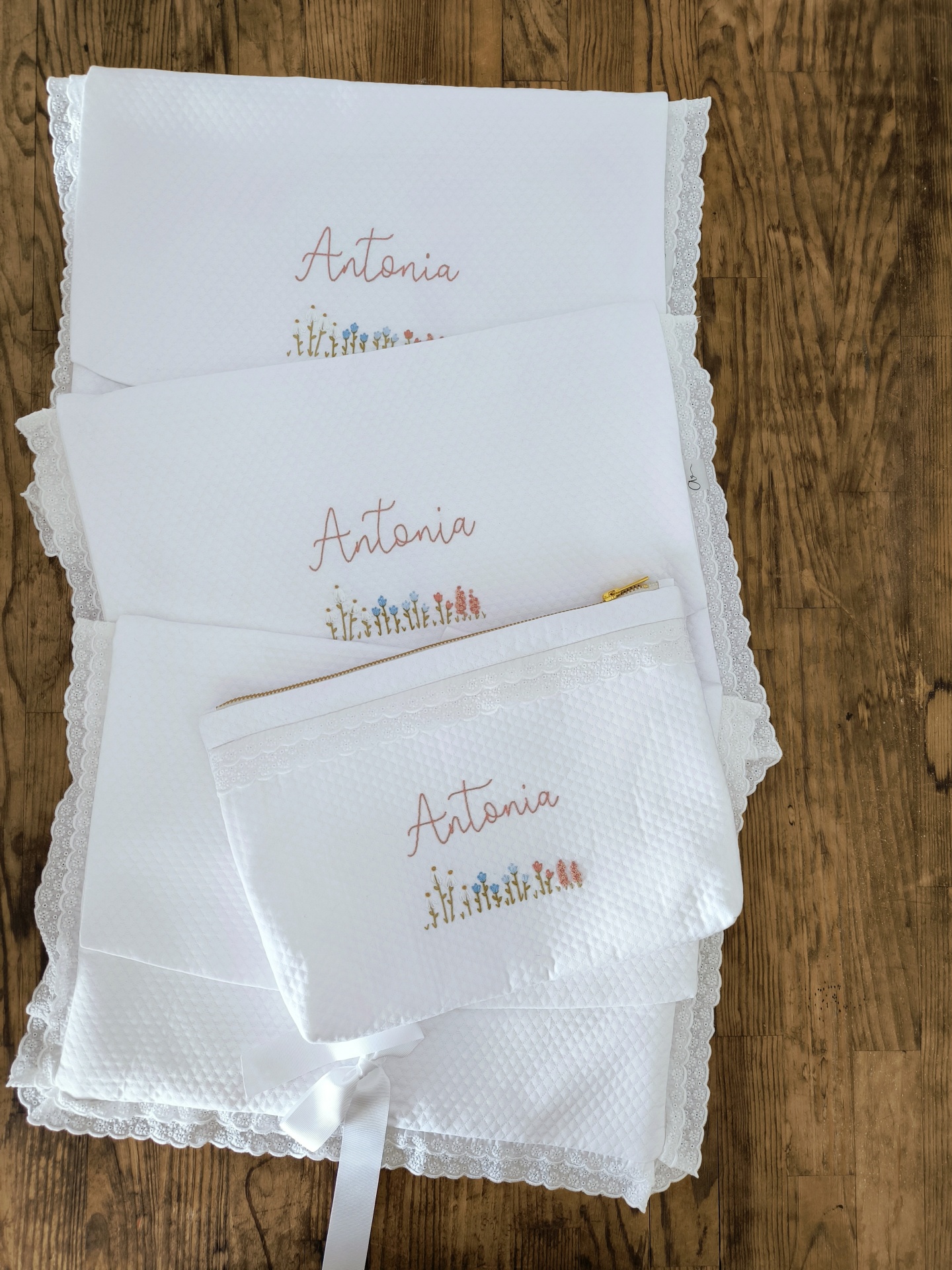 É bordado à mão e personalizado com nome e flores e detalhe de renda valencienne.