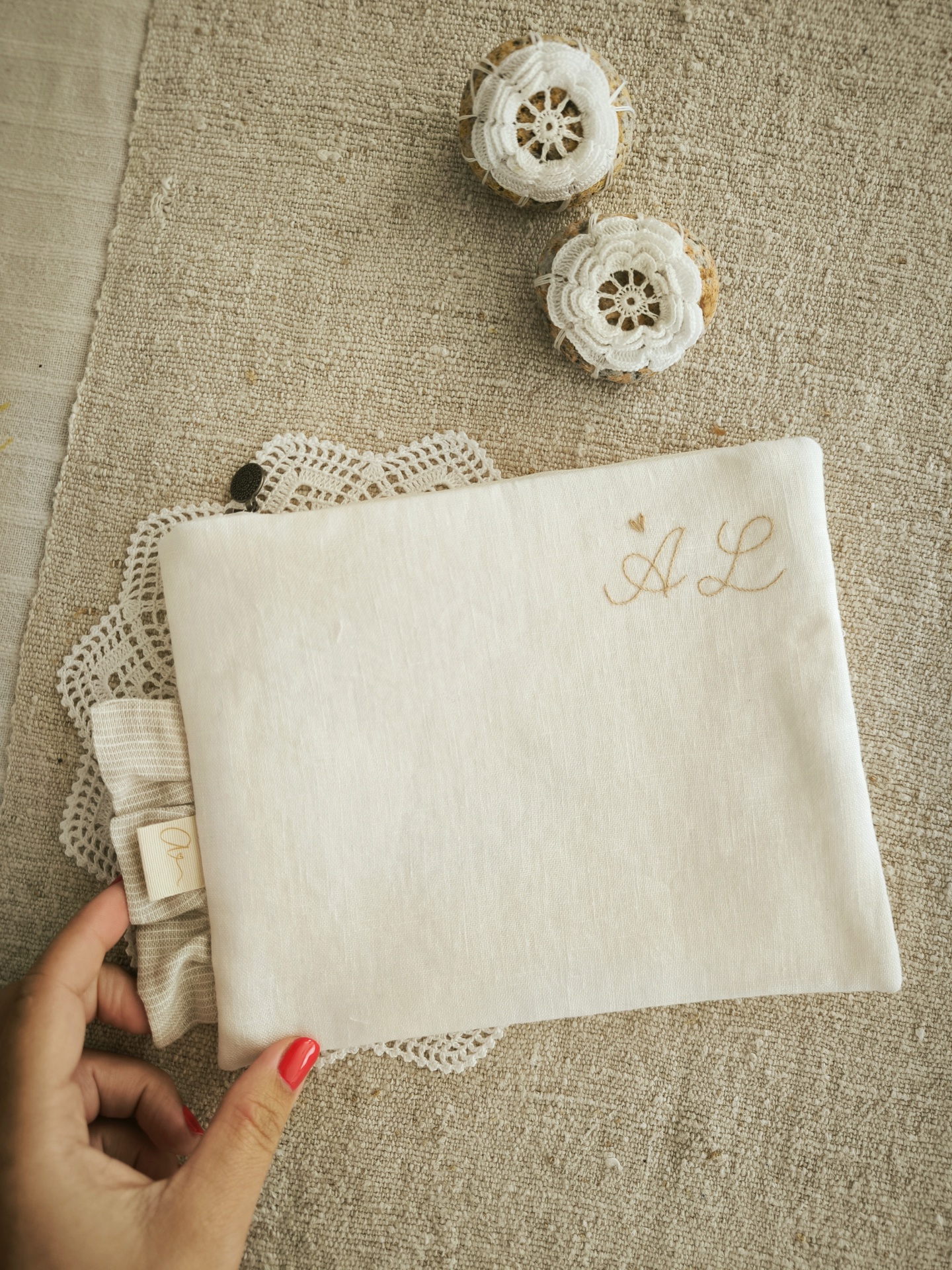 saquinho necessaire em linho 30,00 € Desconto de %. Partilhar Modelo linho puro branco linho riscas bege personalização Comprar Contactar SKU: N02 Para os mais Pequeninos, para usar desde o primeiro dia, em passeio e viagens, para ter tudo o que precisam no mesmo lugar e fácil de encontrar! Para a Mãe, porque nas bolsas da mãe encontrámos sempre tudoo! É bordado à mão e personalizado com nome ou inicial e detalhe de folho. Feito em linho puro e com forro de algodão 23*16 cm aproximadamente Bordado à mão por encomenda. O prazo de entrega é de cerca de um mês.