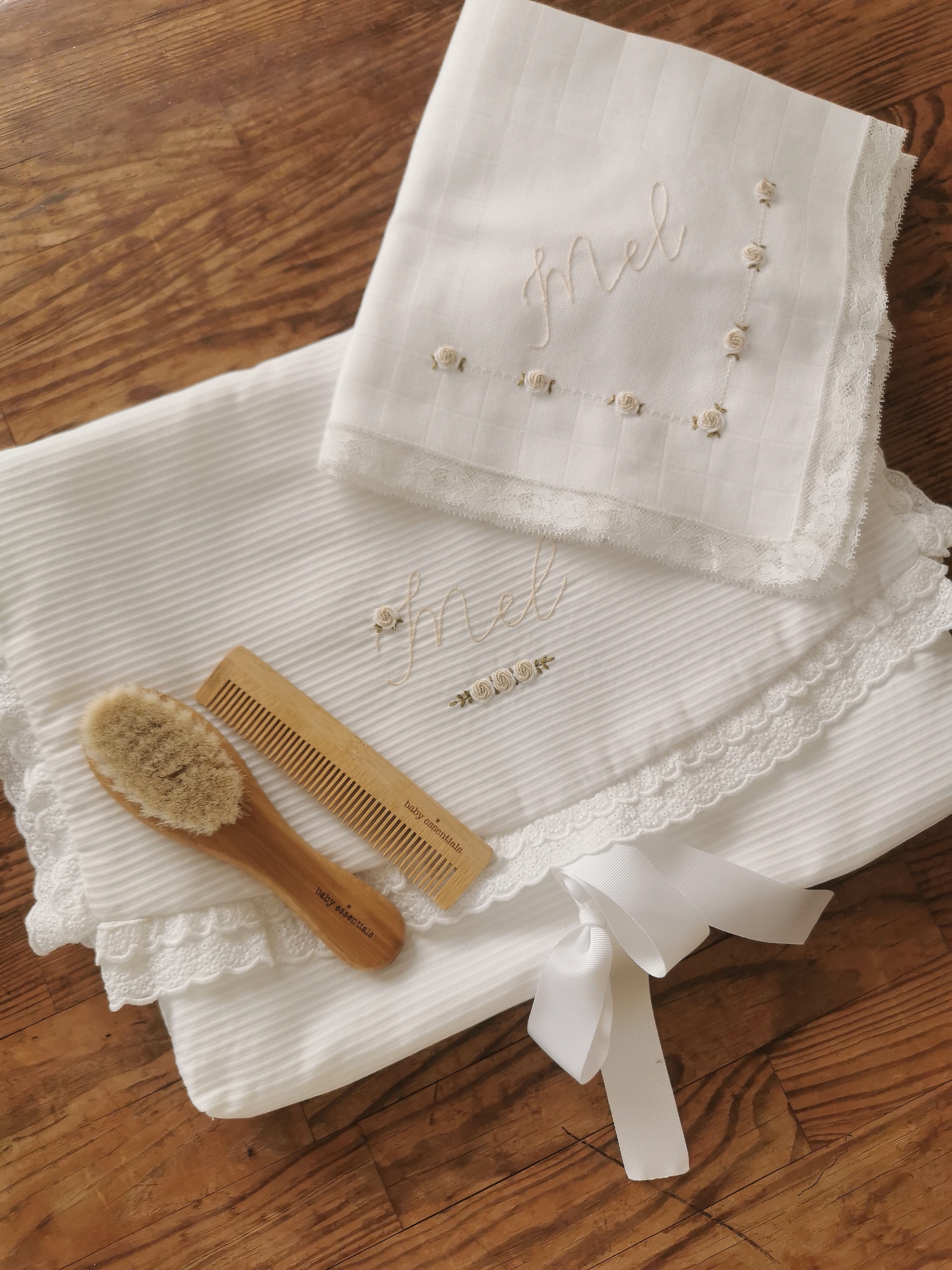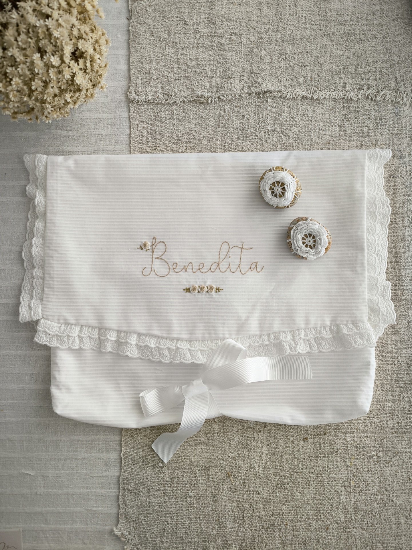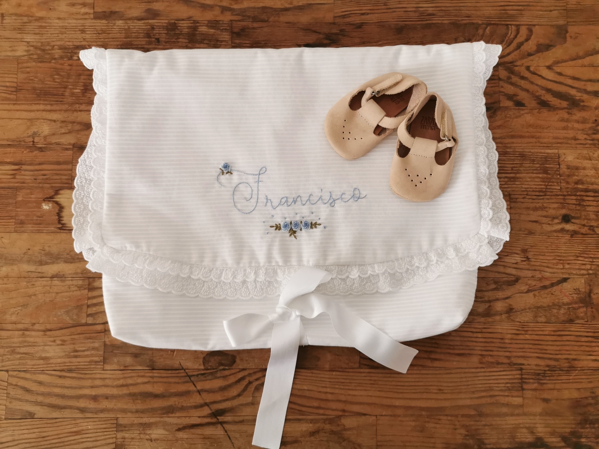 É bordado à mão, com acabamento de bordado inglês e fecho com laço.