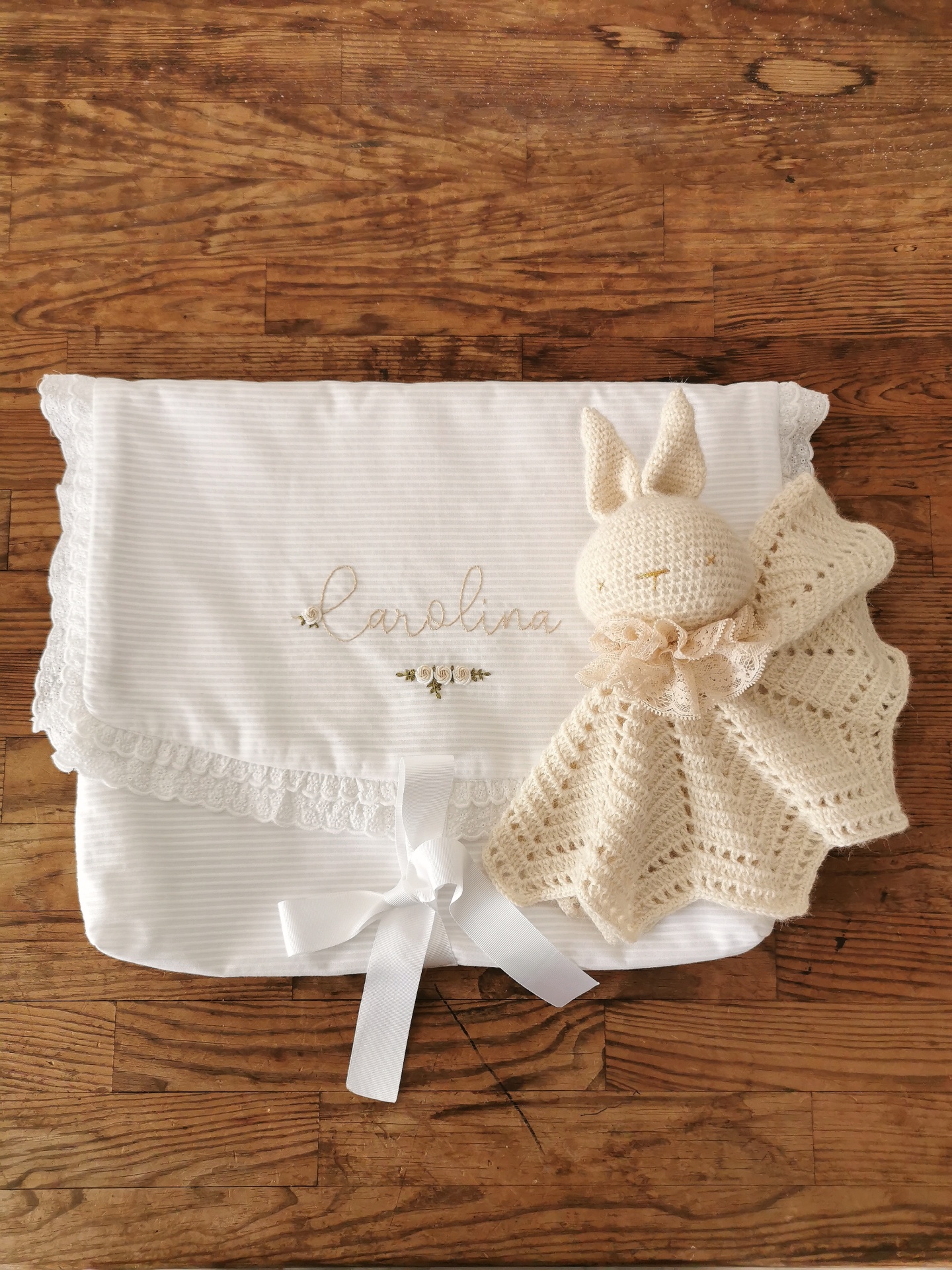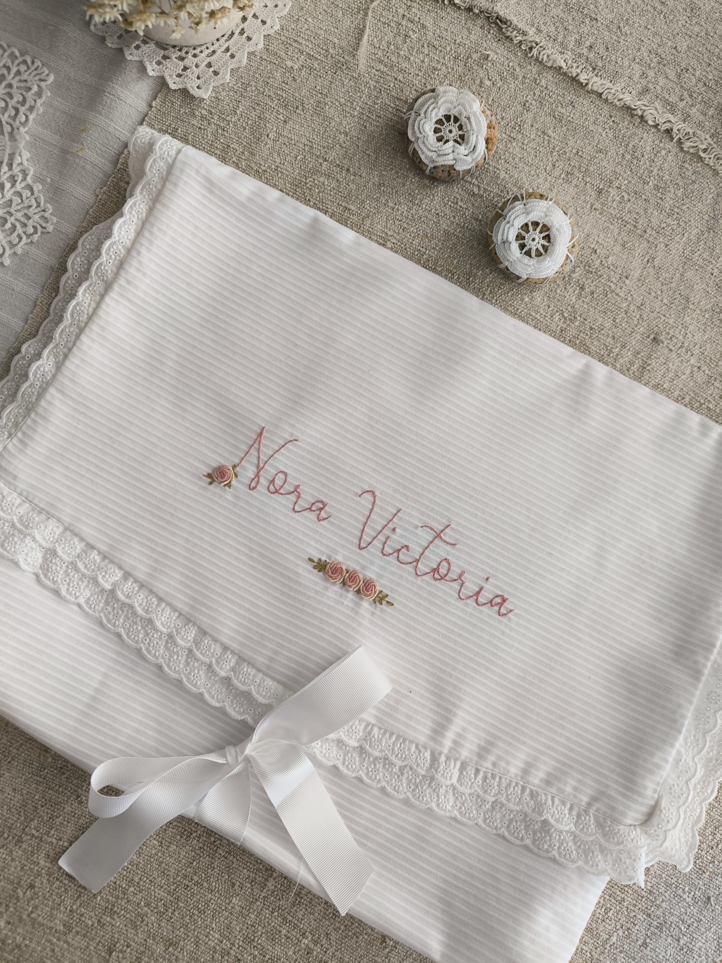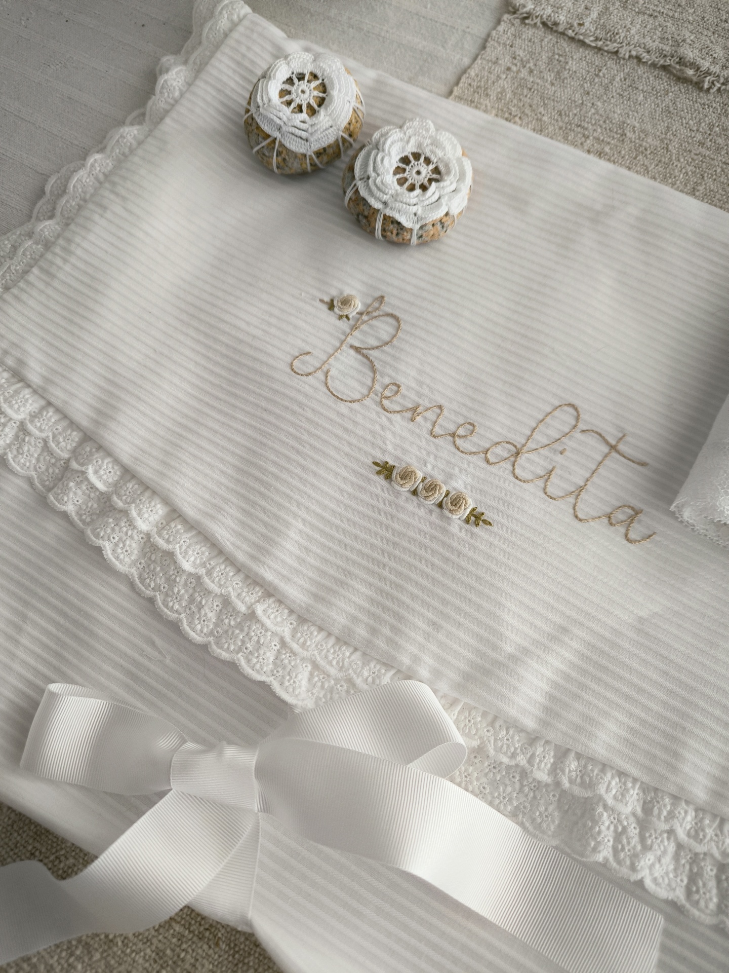 É bordado à mão, com acabamento de bordado inglês e fecho com laço.